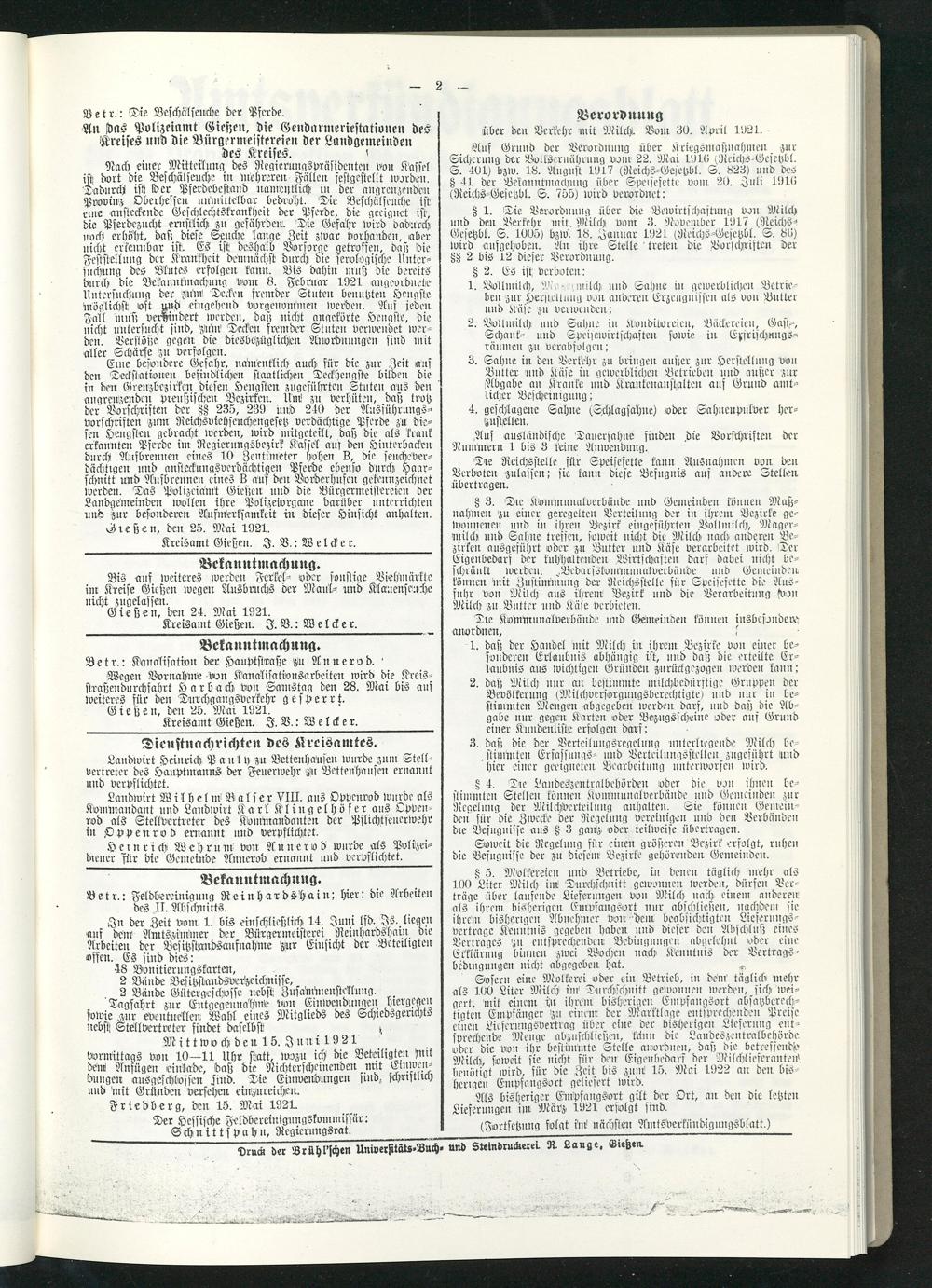 Amtsverkündigungsblatt für die Provinzialdirektion Oberhessen und der Kreisämter Gießen, Friedberg, Büdingen, Lauterbach, Schotten und Alsfeld. 1919-1937