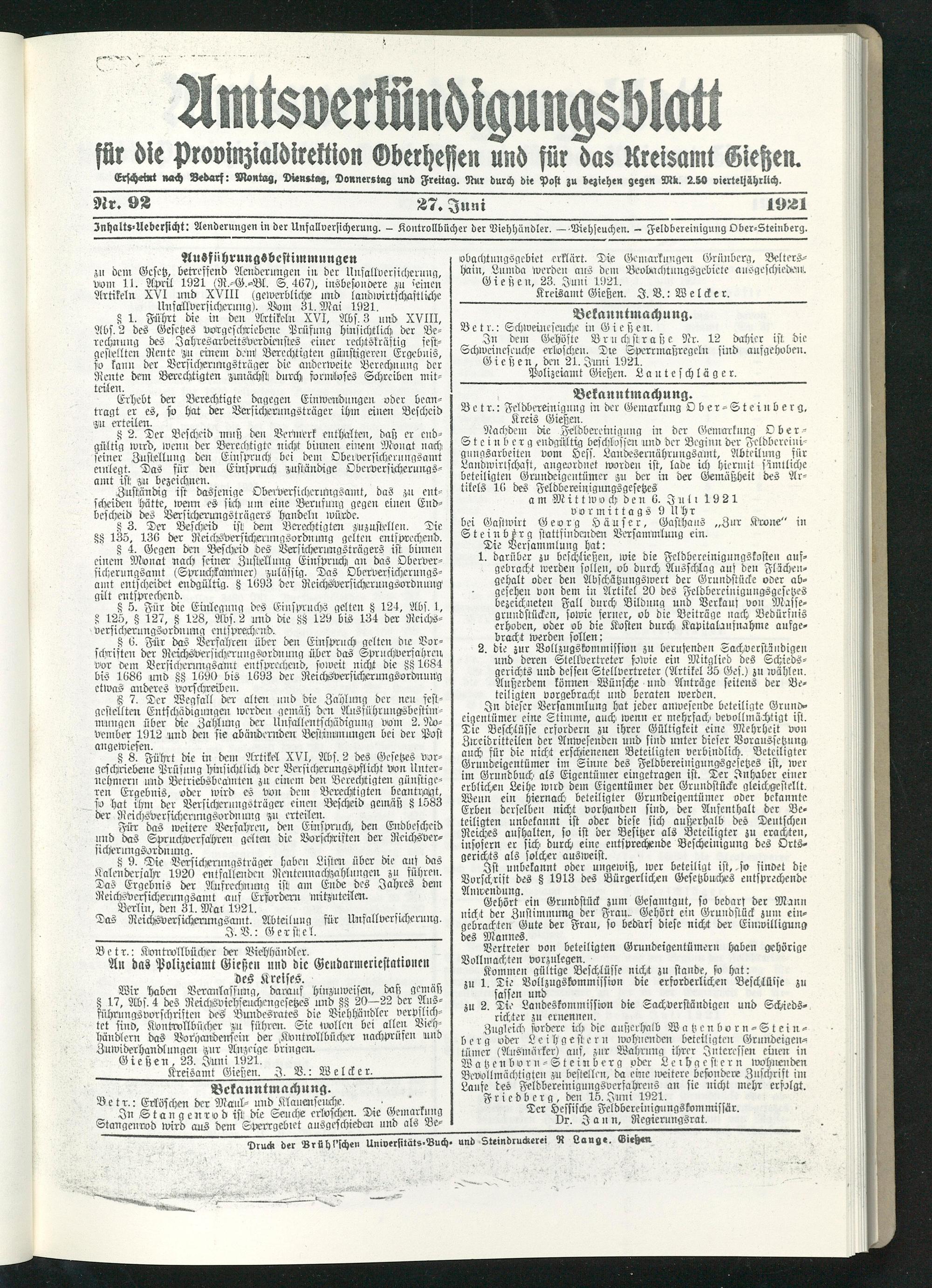 Amtsverkündigungsblatt für die Provinzialdirektion Oberhessen und der Kreisämter Gießen, Friedberg, Büdingen, Lauterbach, Schotten und Alsfeld. 1919-1937