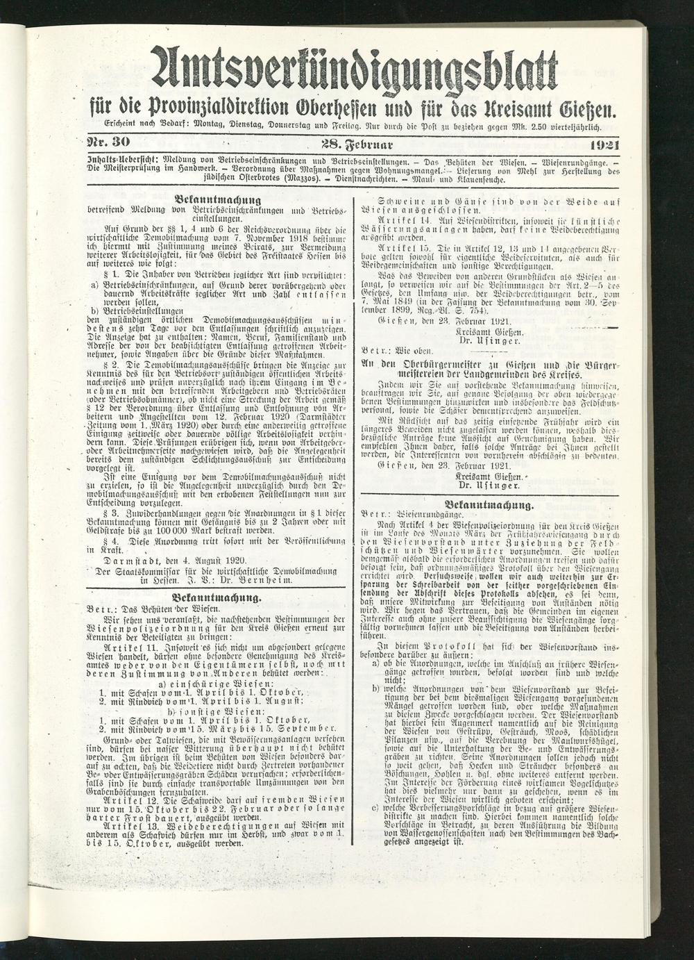 Amtsverkündigungsblatt für die Provinzialdirektion Oberhessen und der Kreisämter Gießen, Friedberg, Büdingen, Lauterbach, Schotten und Alsfeld. 1919-1937