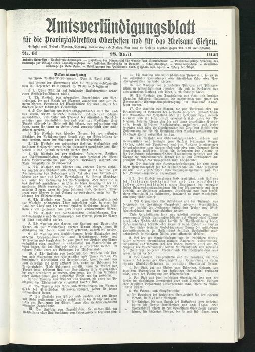 Amtsverkündigungsblatt für die Provinzialdirektion Oberhessen und der Kreisämter Gießen, Friedberg, Büdingen, Lauterbach, Schotten und Alsfeld. 1919-1937
