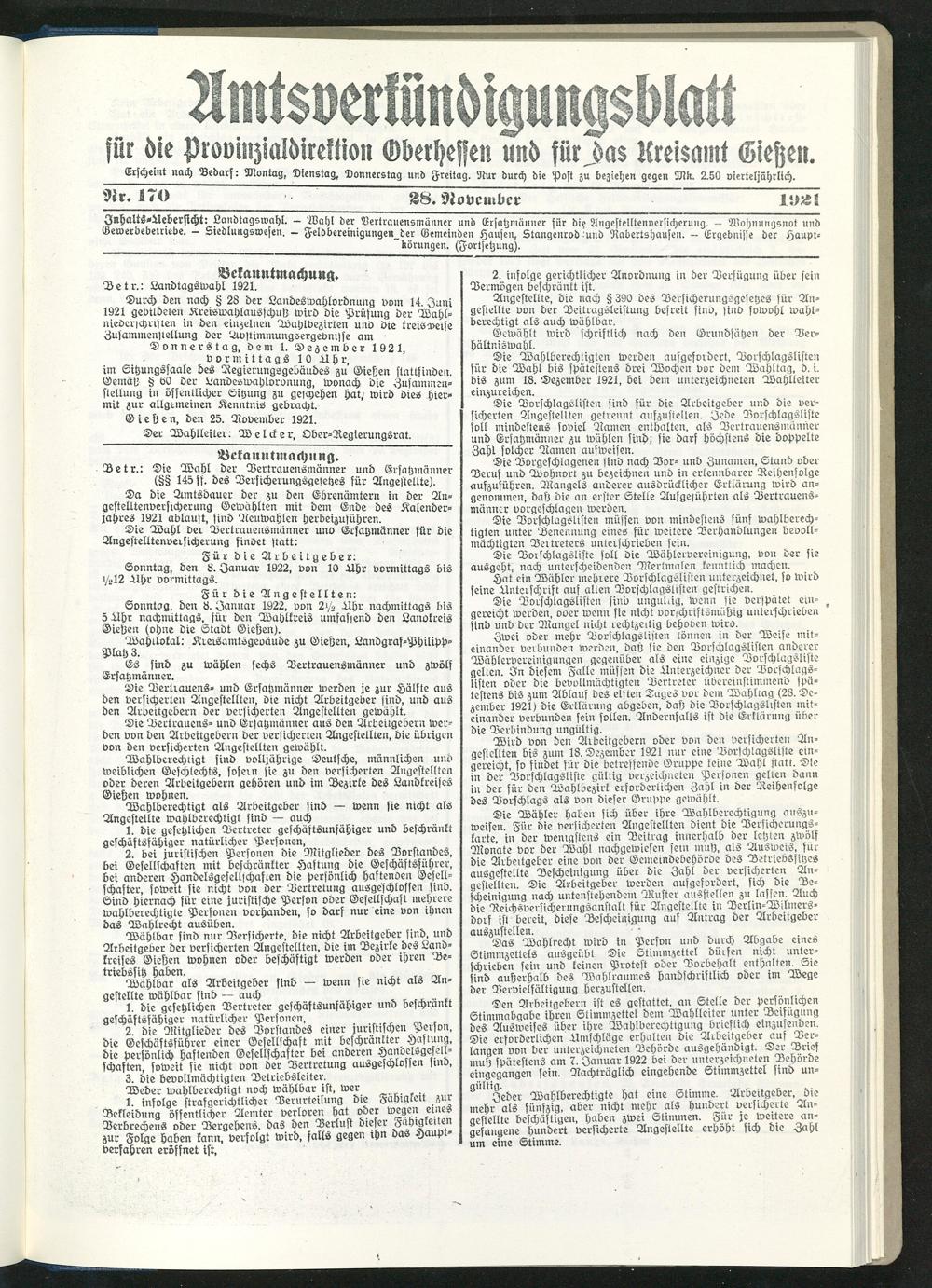 Amtsverkündigungsblatt für die Provinzialdirektion Oberhessen und der Kreisämter Gießen, Friedberg, Büdingen, Lauterbach, Schotten und Alsfeld. 1919-1937