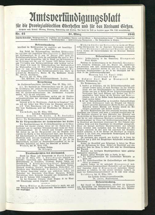 Amtsverkündigungsblatt für die Provinzialdirektion Oberhessen und der Kreisämter Gießen, Friedberg, Büdingen, Lauterbach, Schotten und Alsfeld. 1919-1937