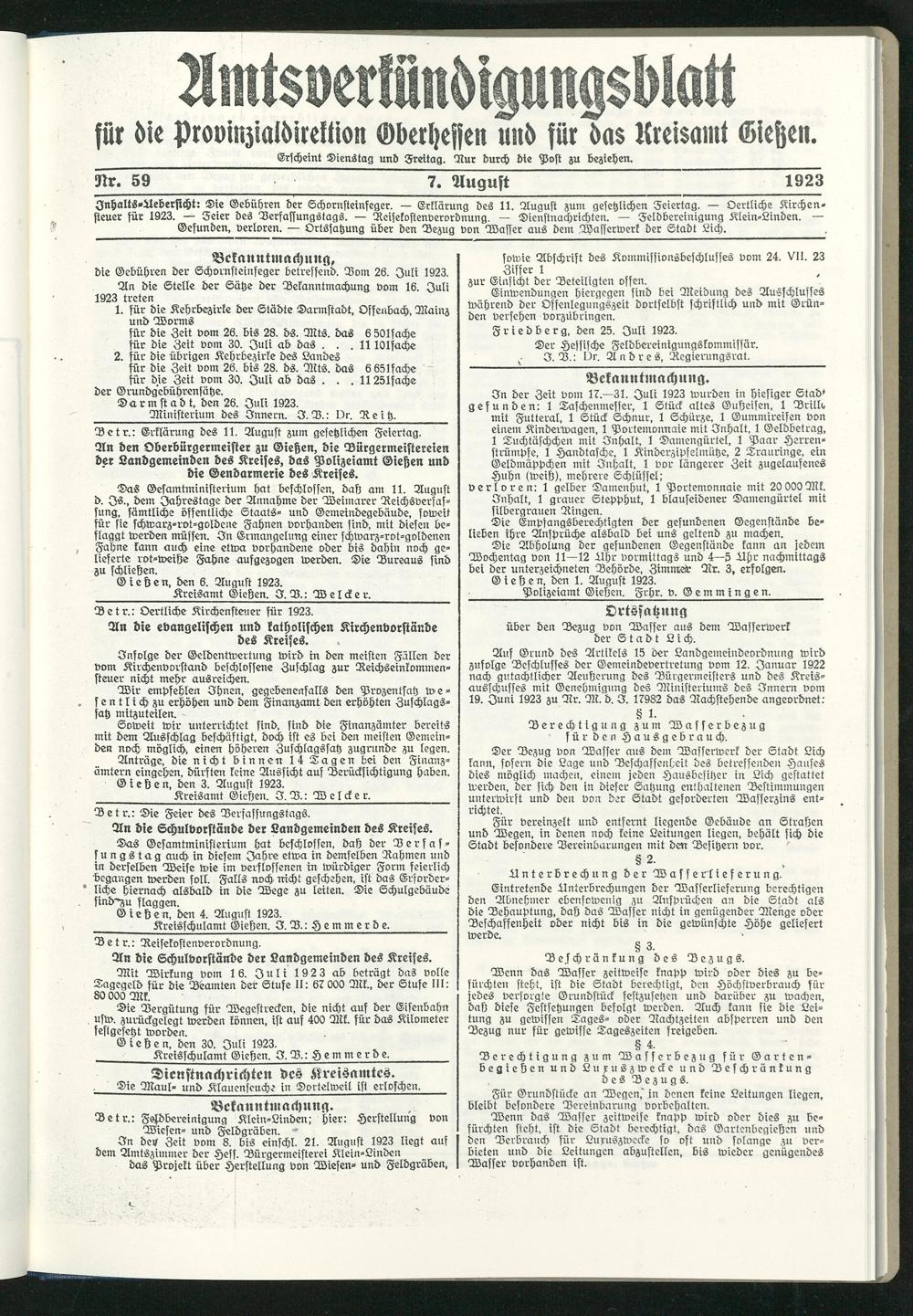 Amtsverkündigungsblatt für die Provinzialdirektion Oberhessen und der Kreisämter Gießen, Friedberg, Büdingen, Lauterbach, Schotten und Alsfeld. 1919-1937