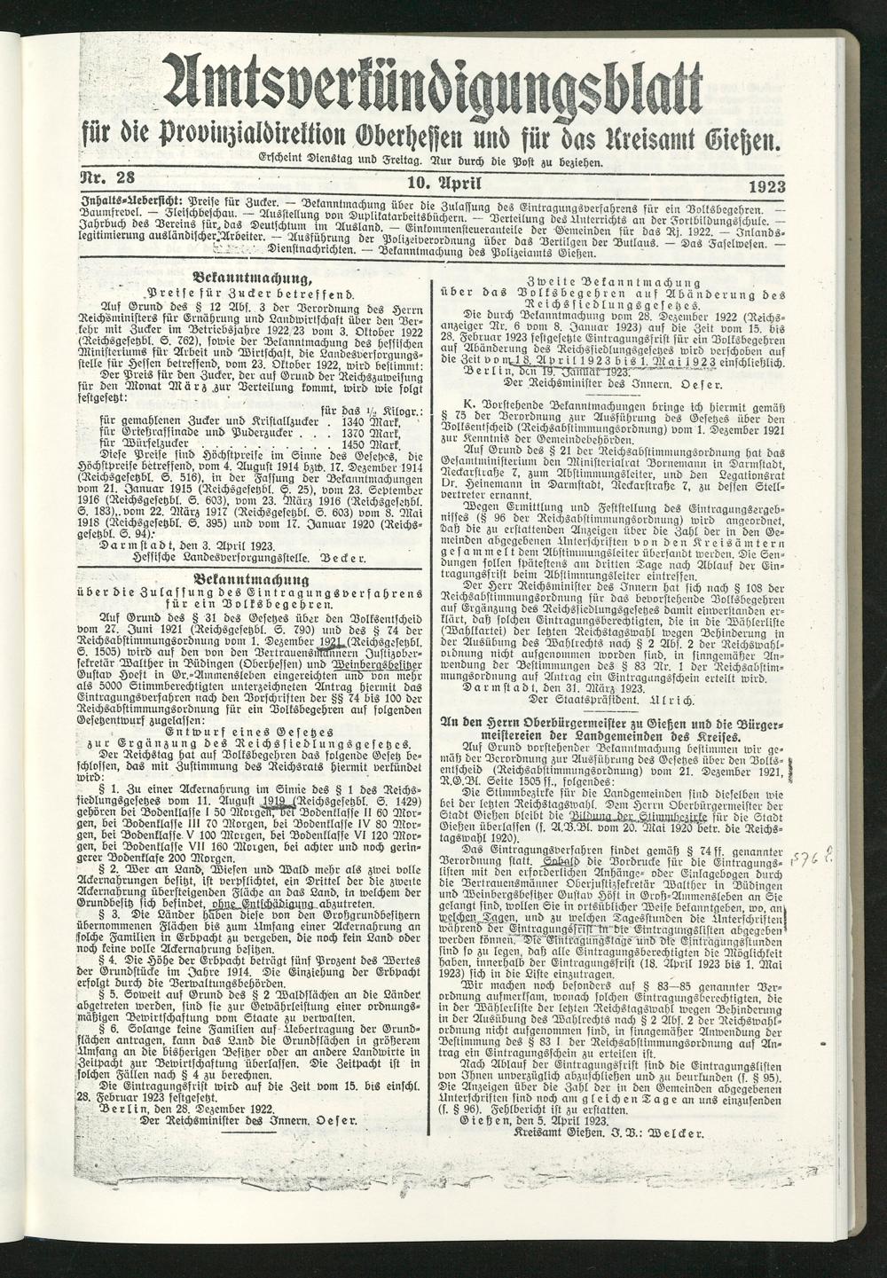 Amtsverkündigungsblatt für die Provinzialdirektion Oberhessen und der Kreisämter Gießen, Friedberg, Büdingen, Lauterbach, Schotten und Alsfeld. 1919-1937