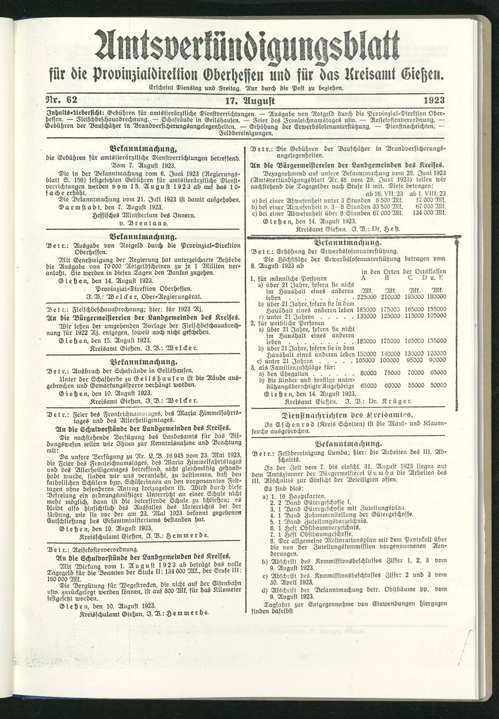 Amtsverkündigungsblatt für die Provinzialdirektion Oberhessen und der Kreisämter Gießen, Friedberg, Büdingen, Lauterbach, Schotten und Alsfeld. 1919-1937