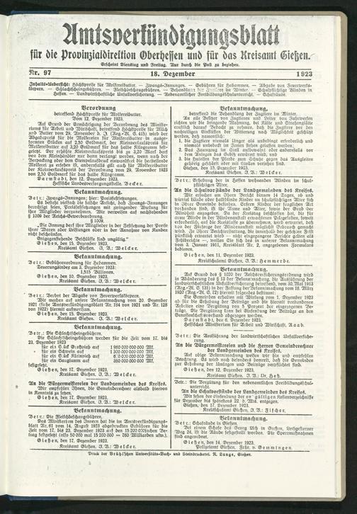 Amtsverkündigungsblatt für die Provinzialdirektion Oberhessen und der Kreisämter Gießen, Friedberg, Büdingen, Lauterbach, Schotten und Alsfeld. 1919-1937