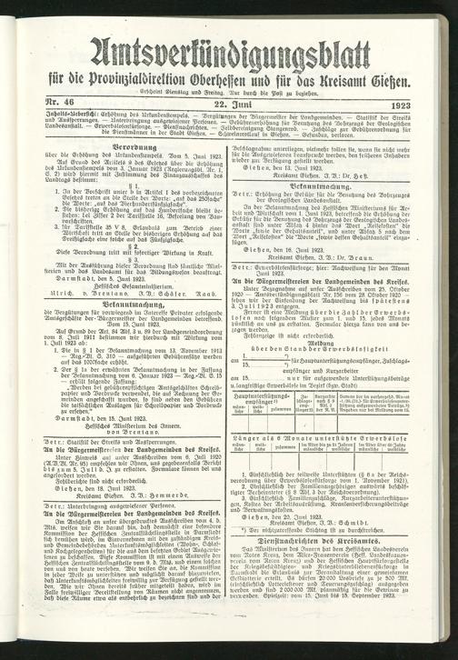 Amtsverkündigungsblatt für die Provinzialdirektion Oberhessen und der Kreisämter Gießen, Friedberg, Büdingen, Lauterbach, Schotten und Alsfeld. 1919-1937