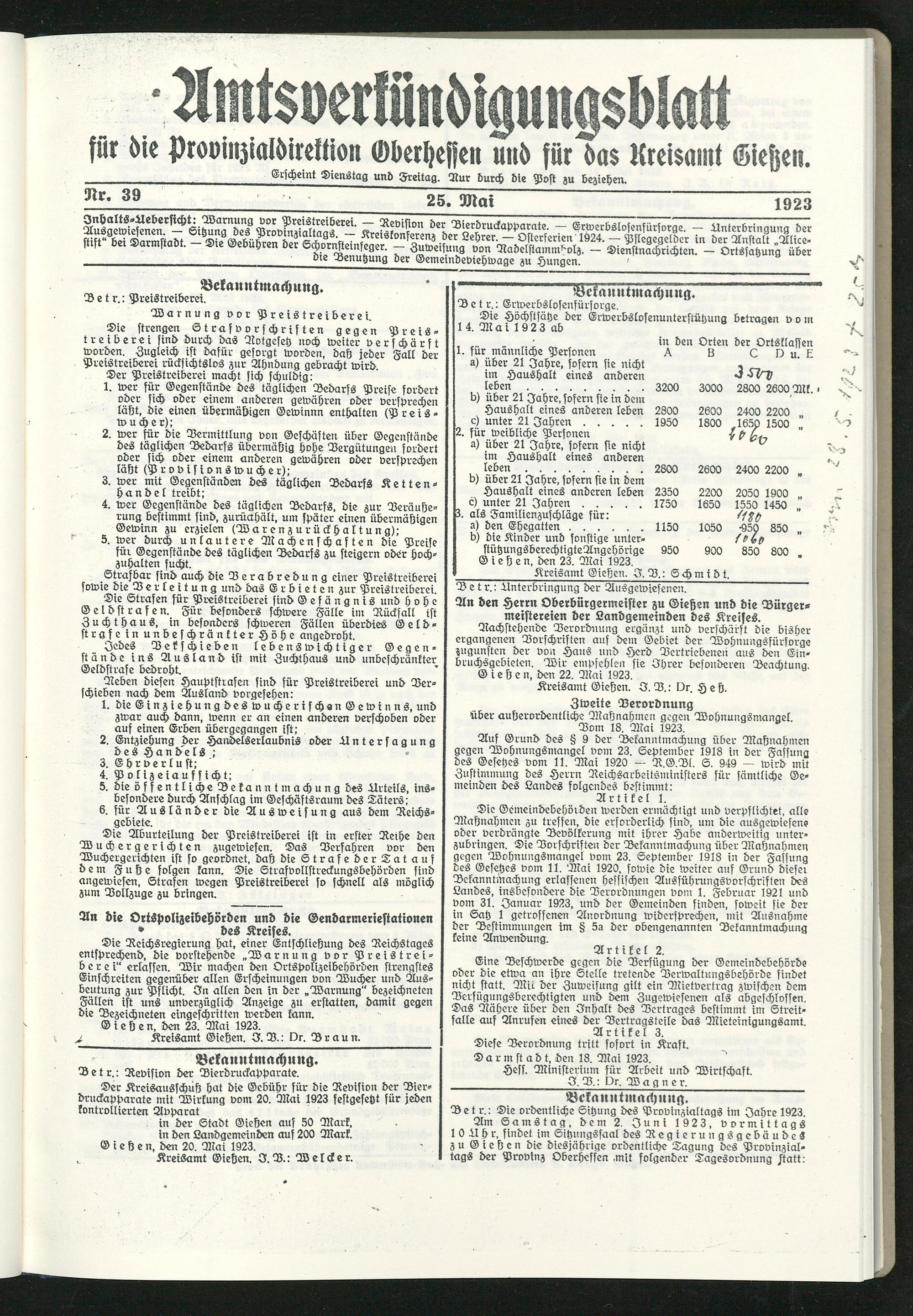 Amtsverkündigungsblatt für die Provinzialdirektion Oberhessen und der Kreisämter Gießen, Friedberg, Büdingen, Lauterbach, Schotten und Alsfeld. 1919-1937