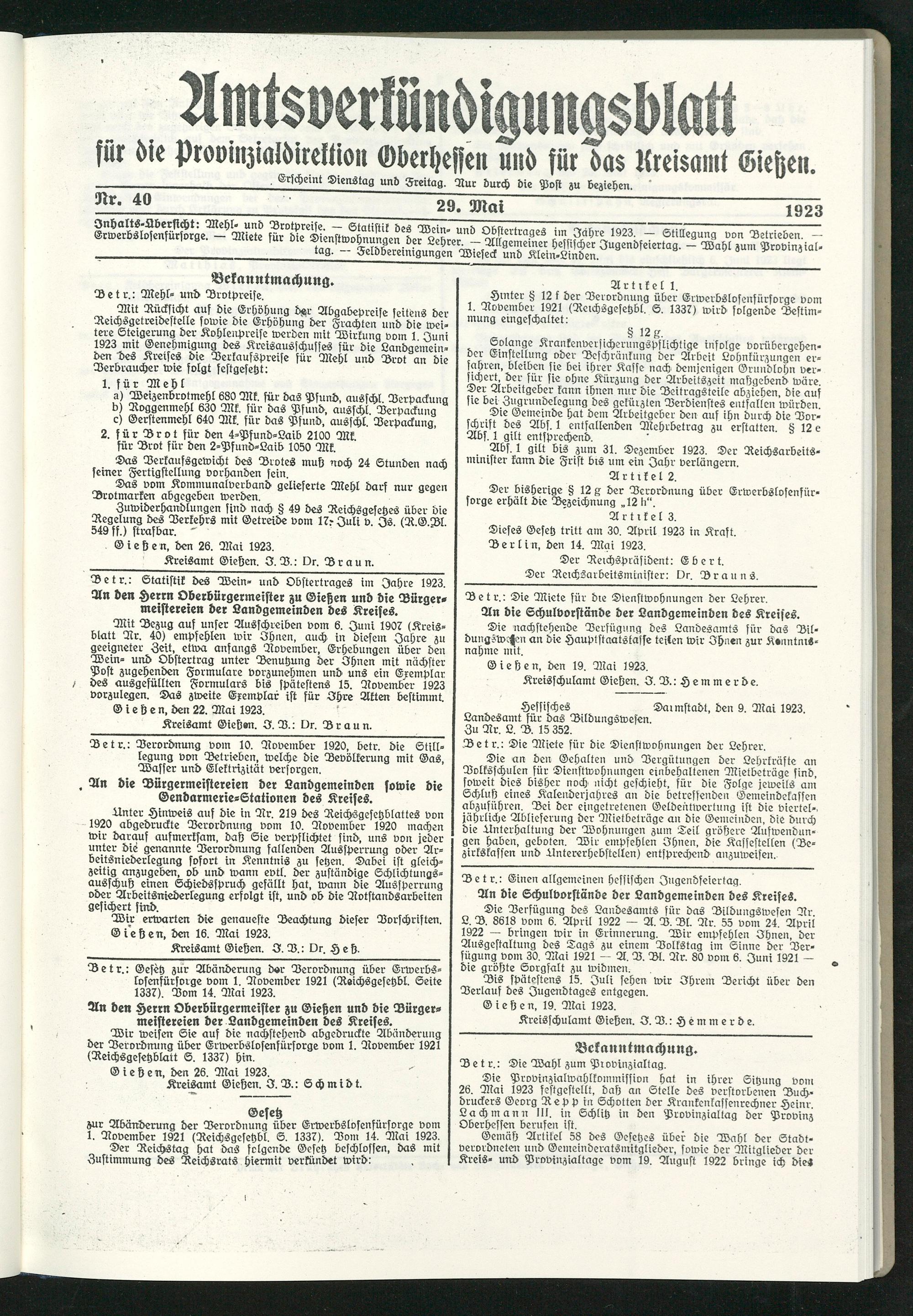 Amtsverkündigungsblatt für die Provinzialdirektion Oberhessen und der Kreisämter Gießen, Friedberg, Büdingen, Lauterbach, Schotten und Alsfeld. 1919-1937