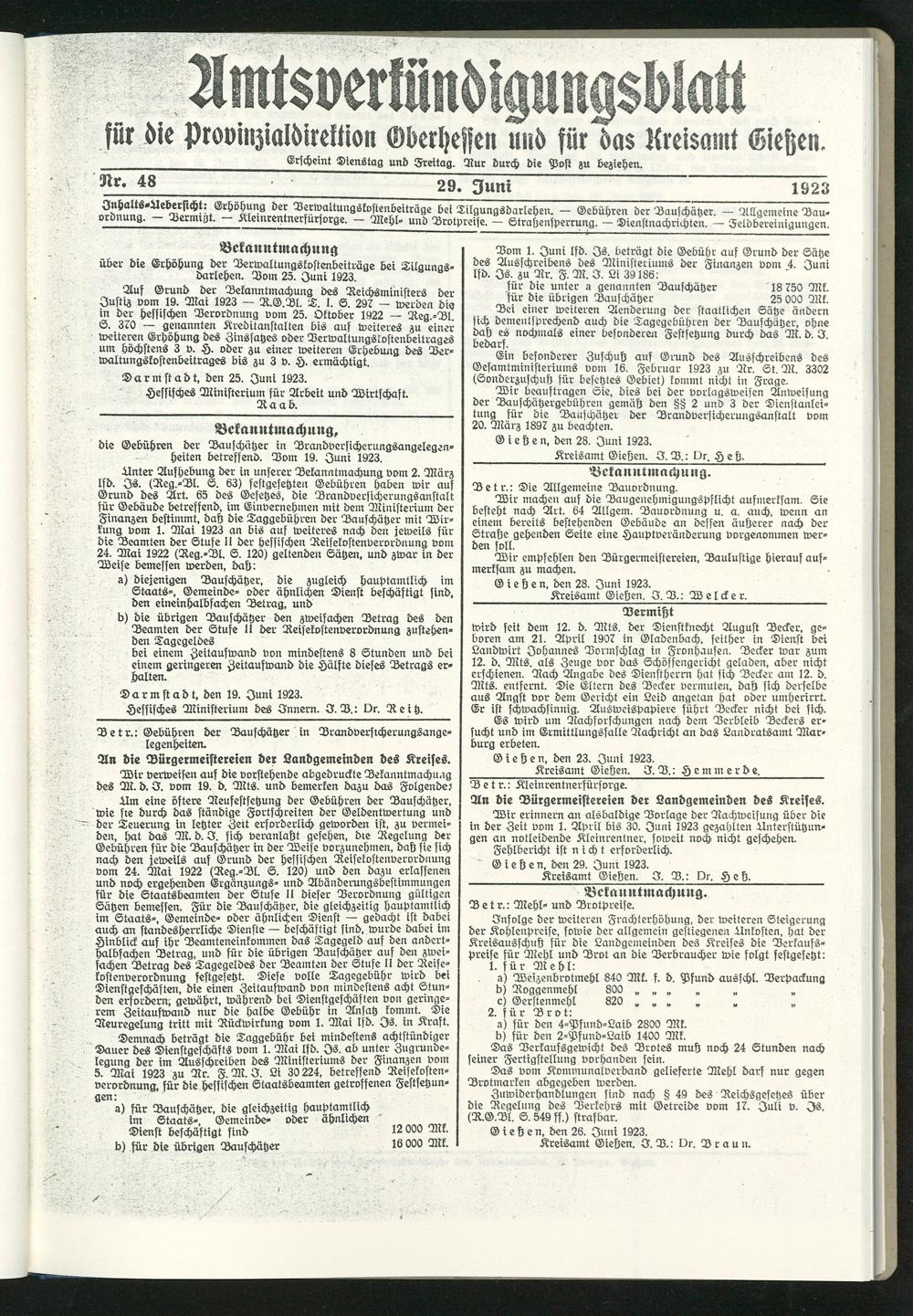 Amtsverkündigungsblatt für die Provinzialdirektion Oberhessen und der Kreisämter Gießen, Friedberg, Büdingen, Lauterbach, Schotten und Alsfeld. 1919-1937