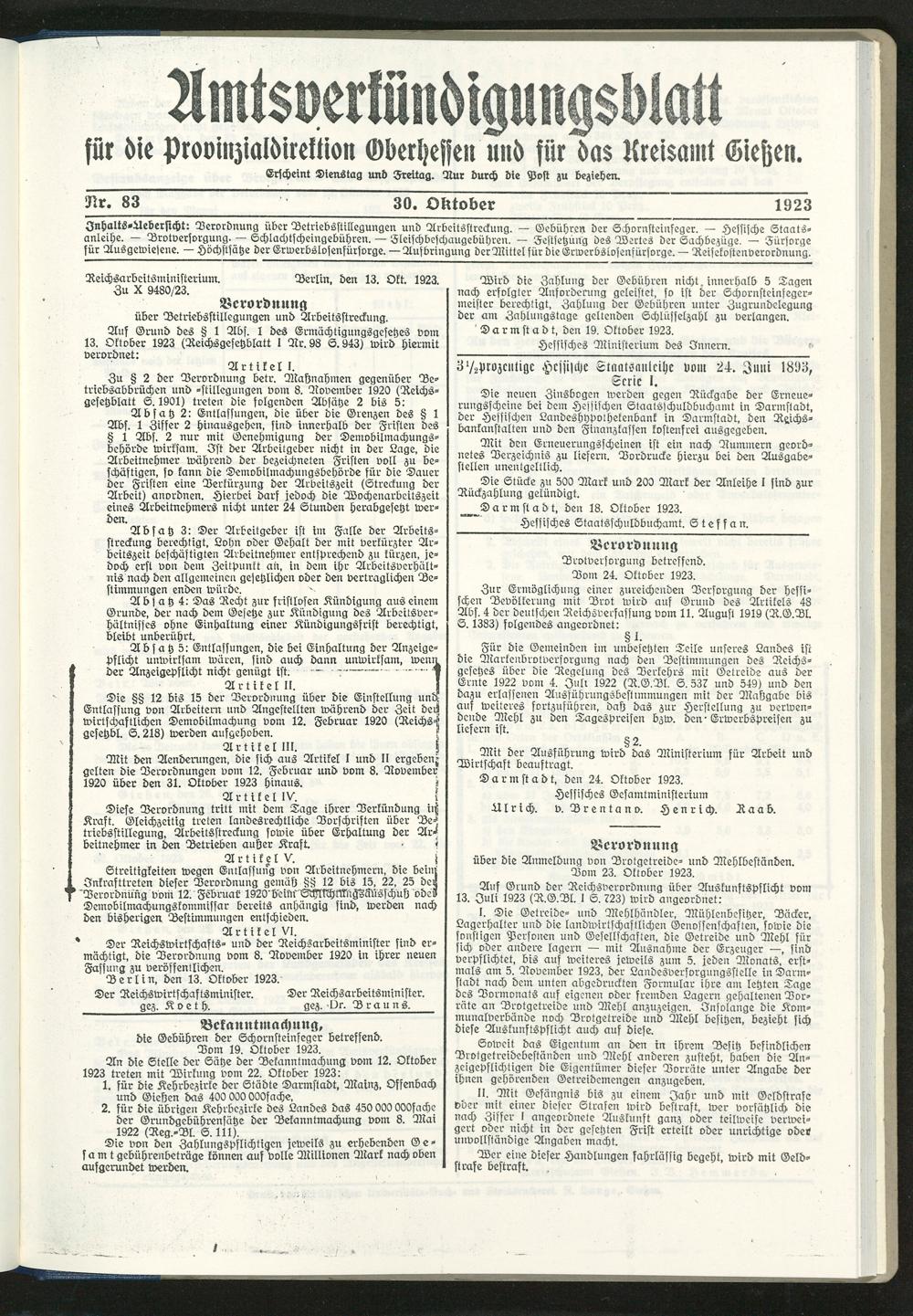 Amtsverkündigungsblatt für die Provinzialdirektion Oberhessen und der Kreisämter Gießen, Friedberg, Büdingen, Lauterbach, Schotten und Alsfeld. 1919-1937