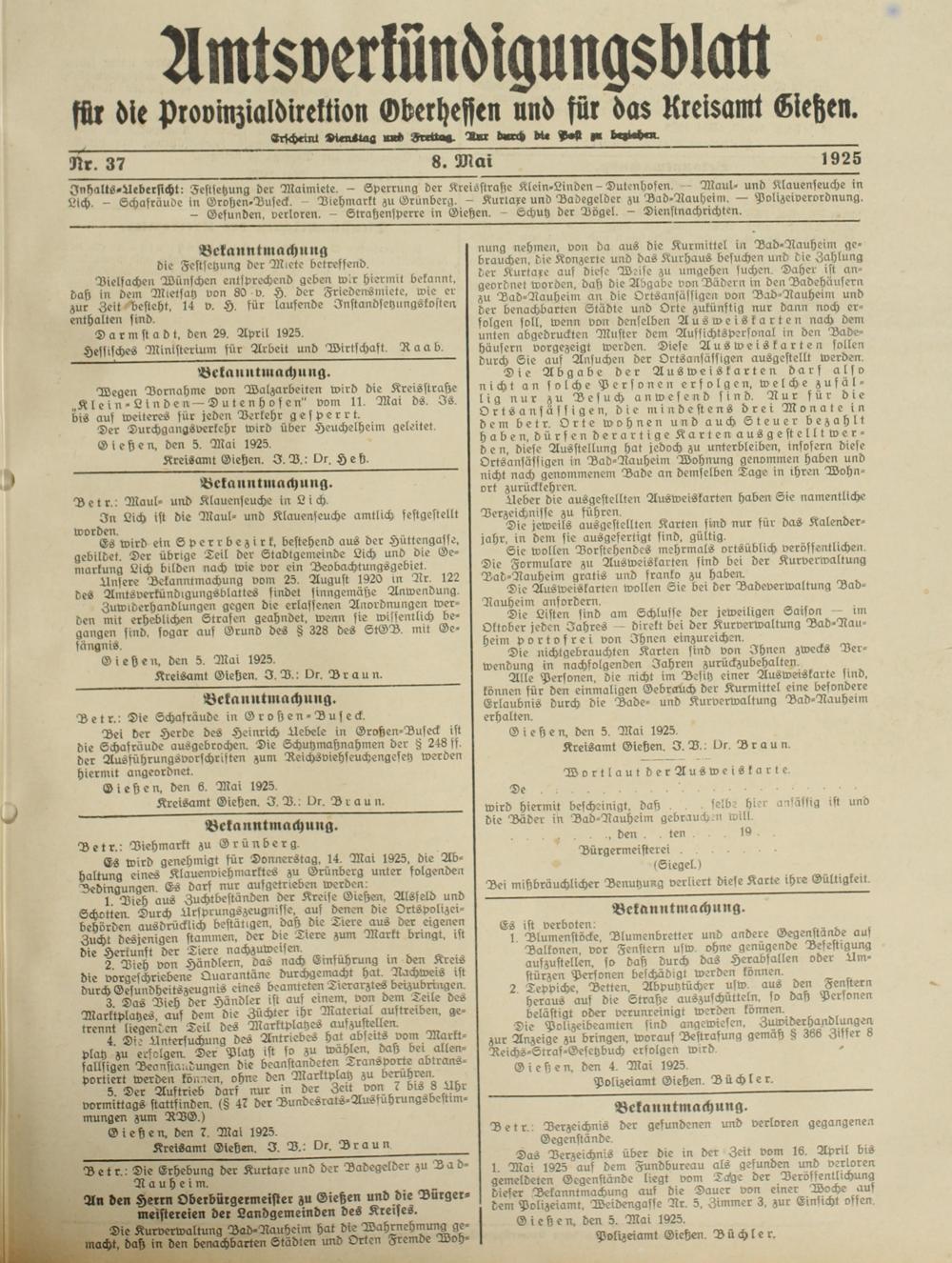 Amtsverkündigungsblatt für die Provinzialdirektion Oberhessen und der Kreisämter Gießen, Friedberg, Büdingen, Lauterbach, Schotten und Alsfeld. 1919-1937