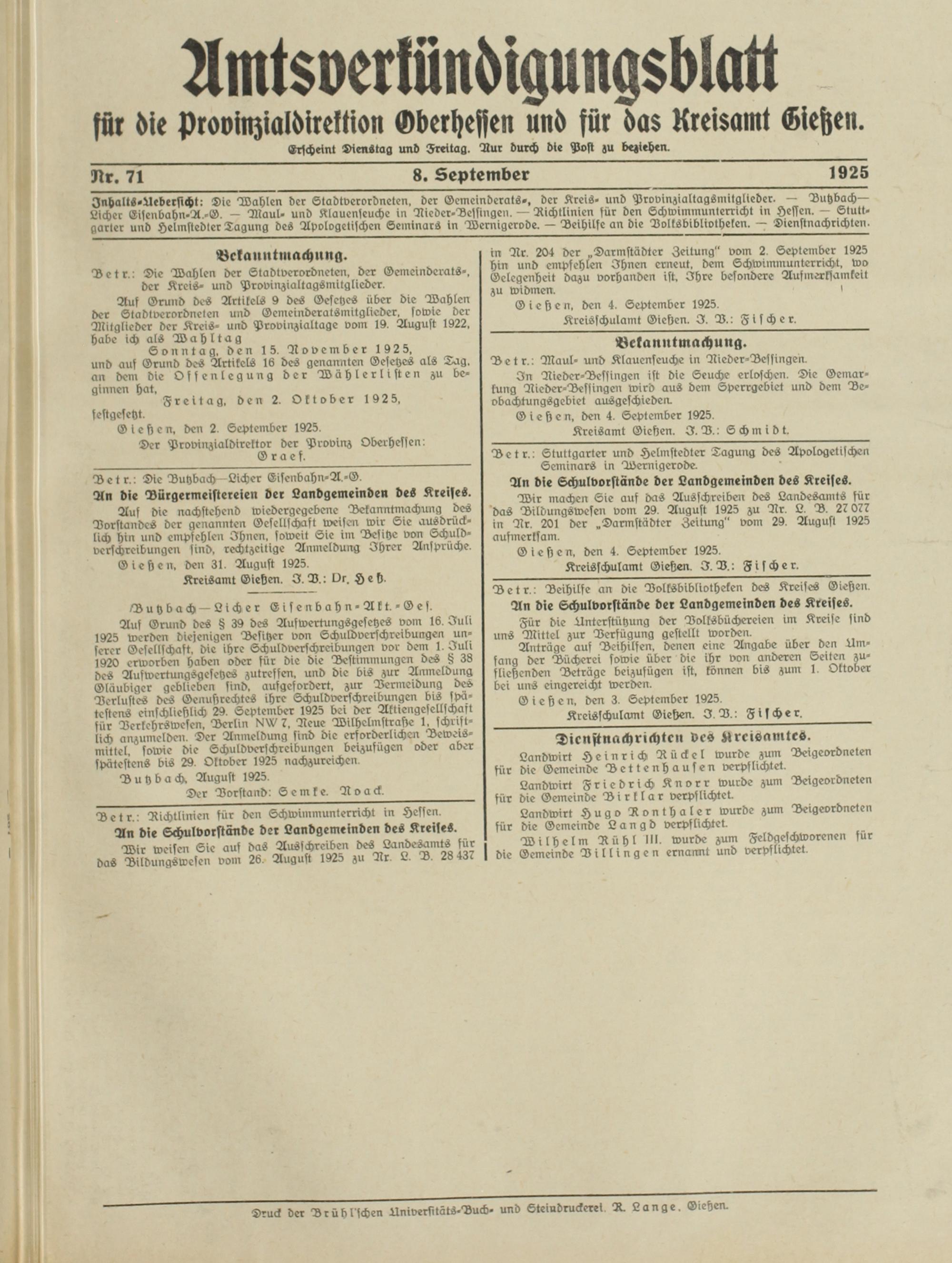 Amtsverkündigungsblatt für die Provinzialdirektion Oberhessen und der Kreisämter Gießen, Friedberg, Büdingen, Lauterbach, Schotten und Alsfeld. 1919-1937
