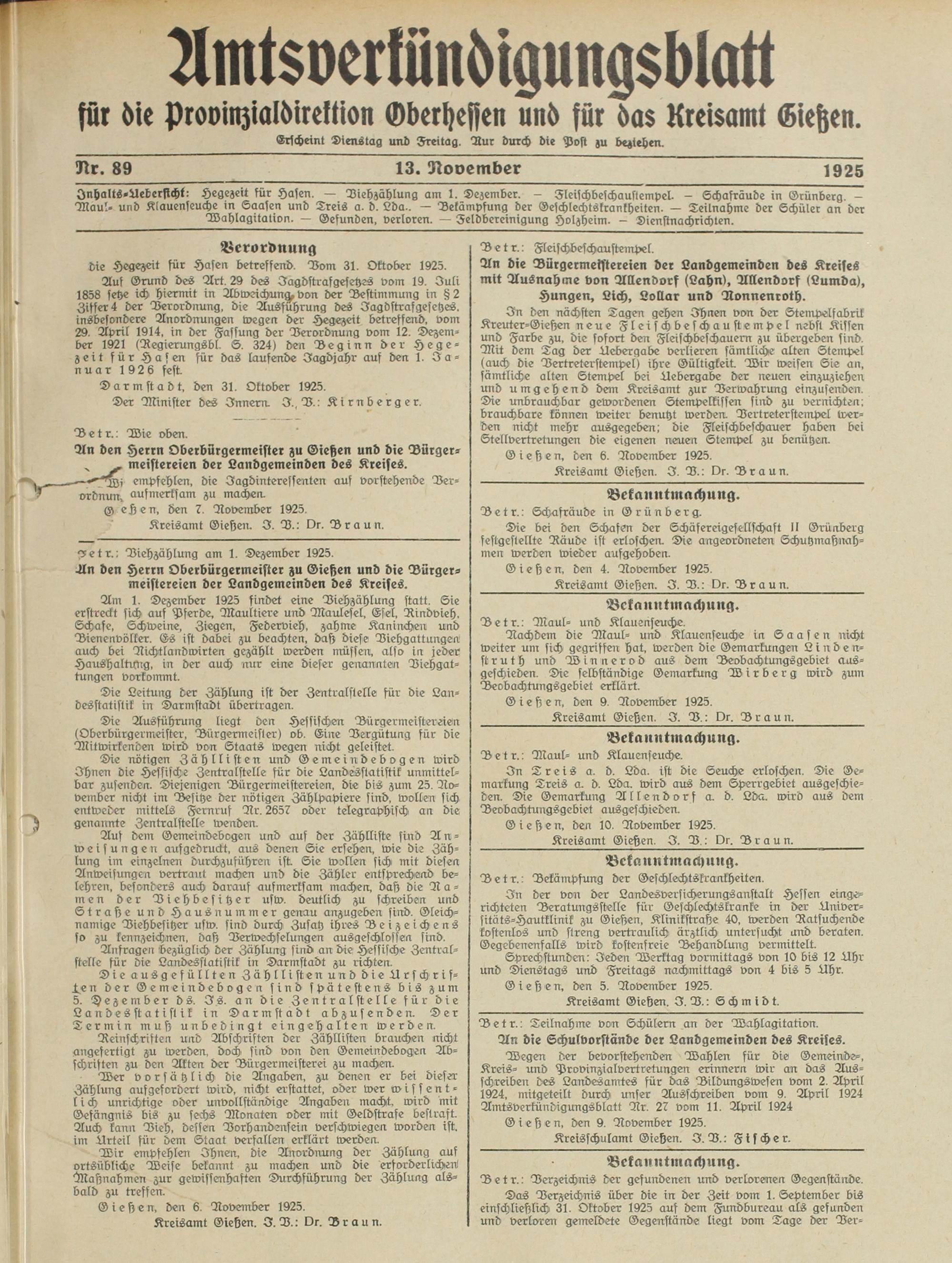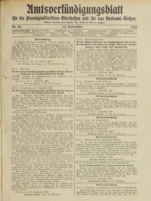 Amtsverkündigungsblatt für die Provinzialdirektion Oberhessen und der Kreisämter Gießen, Friedberg, Büdingen, Lauterbach, Schotten und Alsfeld. 1919-1937
