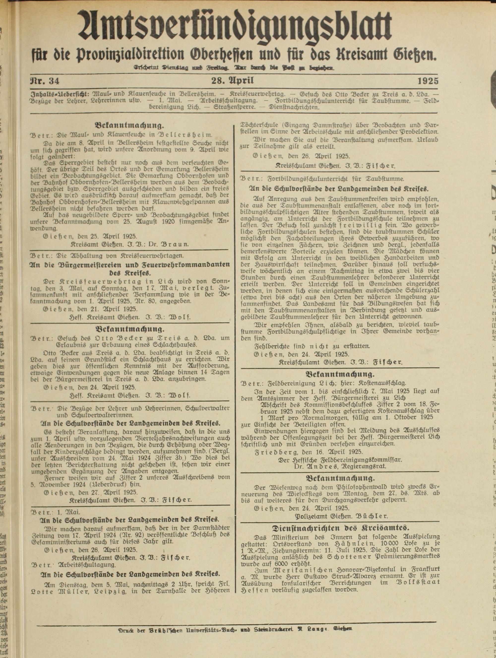 Amtsverkündigungsblatt für die Provinzialdirektion Oberhessen und der Kreisämter Gießen, Friedberg, Büdingen, Lauterbach, Schotten und Alsfeld. 1919-1937