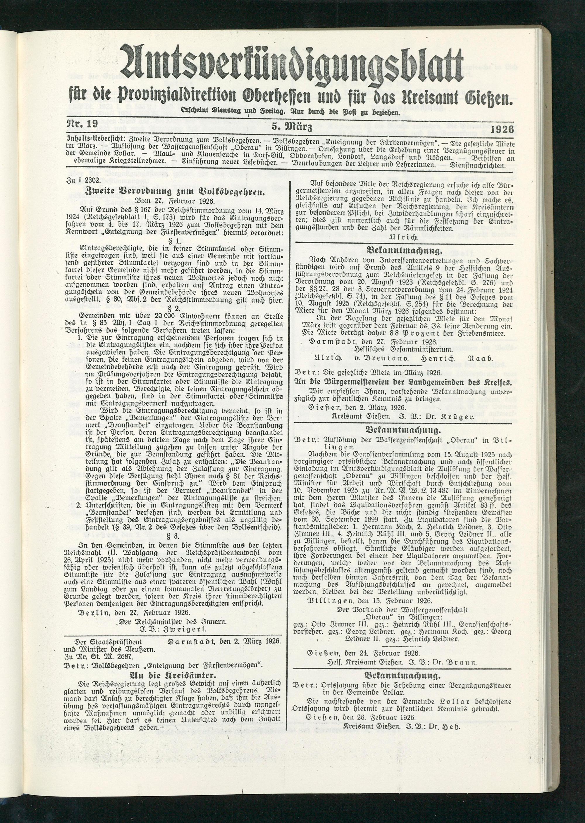 Amtsverkündigungsblatt für die Provinzialdirektion Oberhessen und der Kreisämter Gießen, Friedberg, Büdingen, Lauterbach, Schotten und Alsfeld. 1919-1937