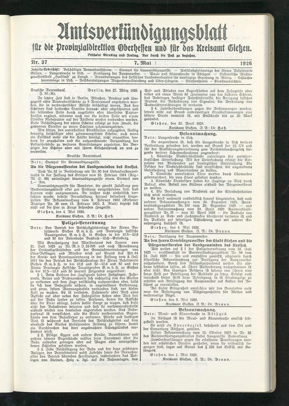 Amtsverkündigungsblatt für die Provinzialdirektion Oberhessen und der Kreisämter Gießen, Friedberg, Büdingen, Lauterbach, Schotten und Alsfeld. 1919-1937