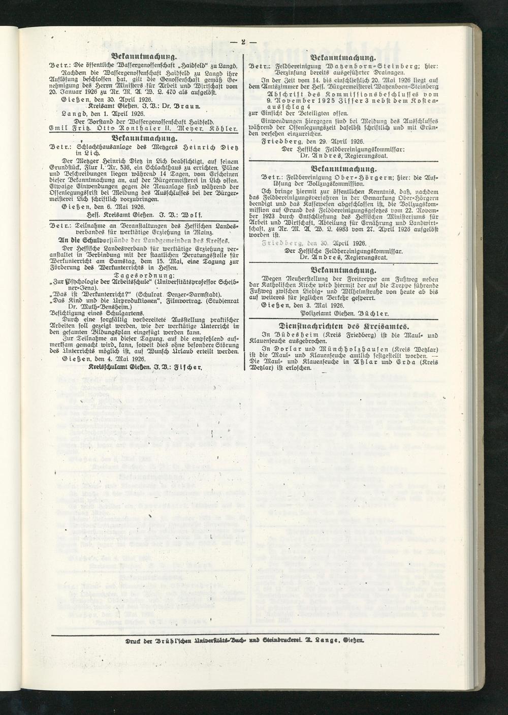 Amtsverkündigungsblatt für die Provinzialdirektion Oberhessen und der Kreisämter Gießen, Friedberg, Büdingen, Lauterbach, Schotten und Alsfeld. 1919-1937