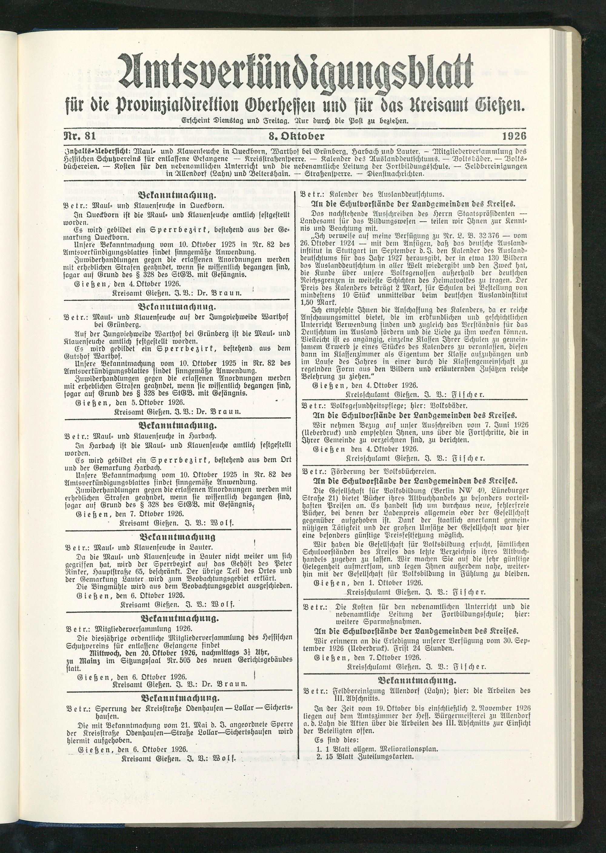 Amtsverkündigungsblatt für die Provinzialdirektion Oberhessen und der Kreisämter Gießen, Friedberg, Büdingen, Lauterbach, Schotten und Alsfeld. 1919-1937