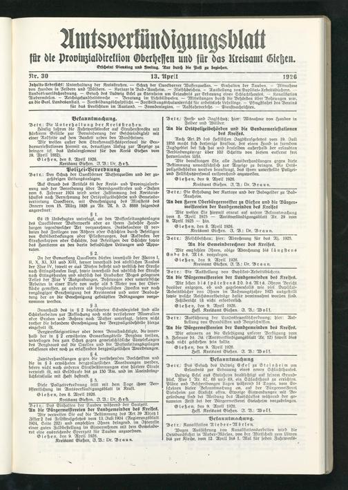 Amtsverkündigungsblatt für die Provinzialdirektion Oberhessen und der Kreisämter Gießen, Friedberg, Büdingen, Lauterbach, Schotten und Alsfeld. 1919-1937