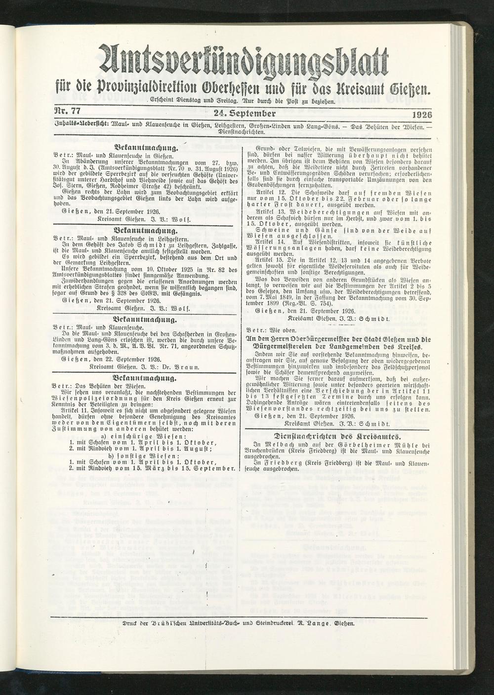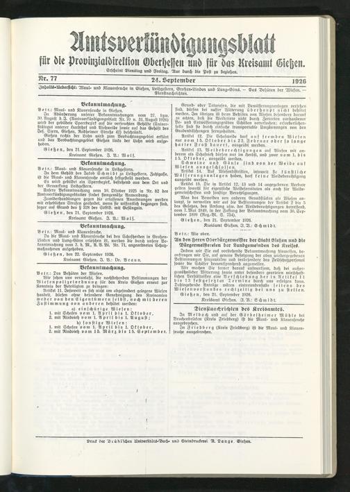 Amtsverkündigungsblatt für die Provinzialdirektion Oberhessen und der Kreisämter Gießen, Friedberg, Büdingen, Lauterbach, Schotten und Alsfeld. 1919-1937