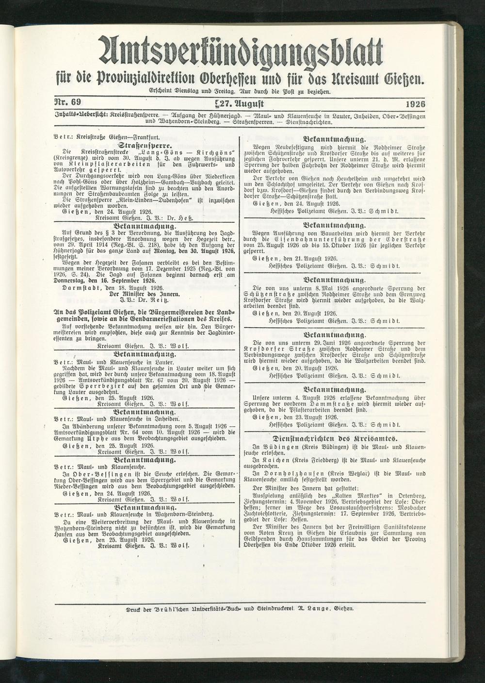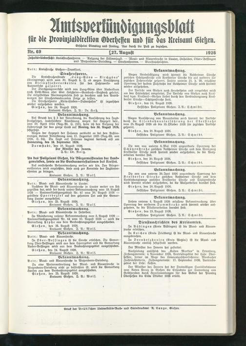 Amtsverkündigungsblatt für die Provinzialdirektion Oberhessen und der Kreisämter Gießen, Friedberg, Büdingen, Lauterbach, Schotten und Alsfeld. 1919-1937