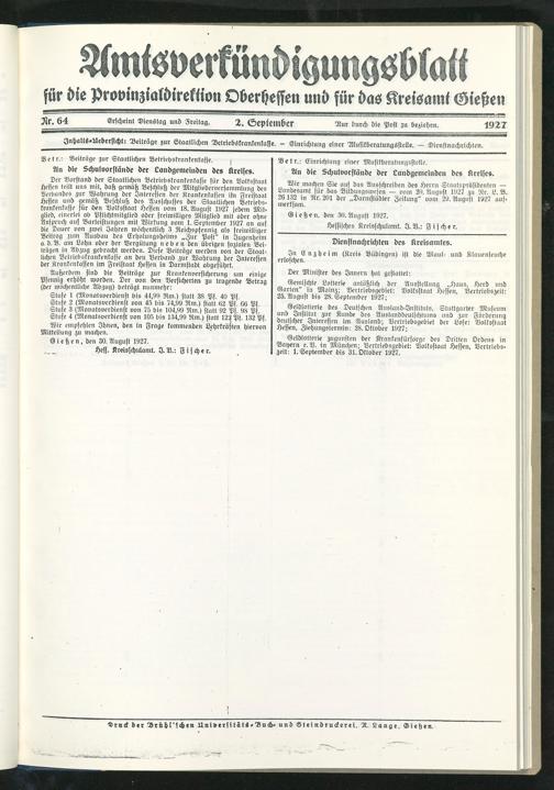 Amtsverkündigungsblatt für die Provinzialdirektion Oberhessen und der Kreisämter Gießen, Friedberg, Büdingen, Lauterbach, Schotten und Alsfeld. 1919-1937