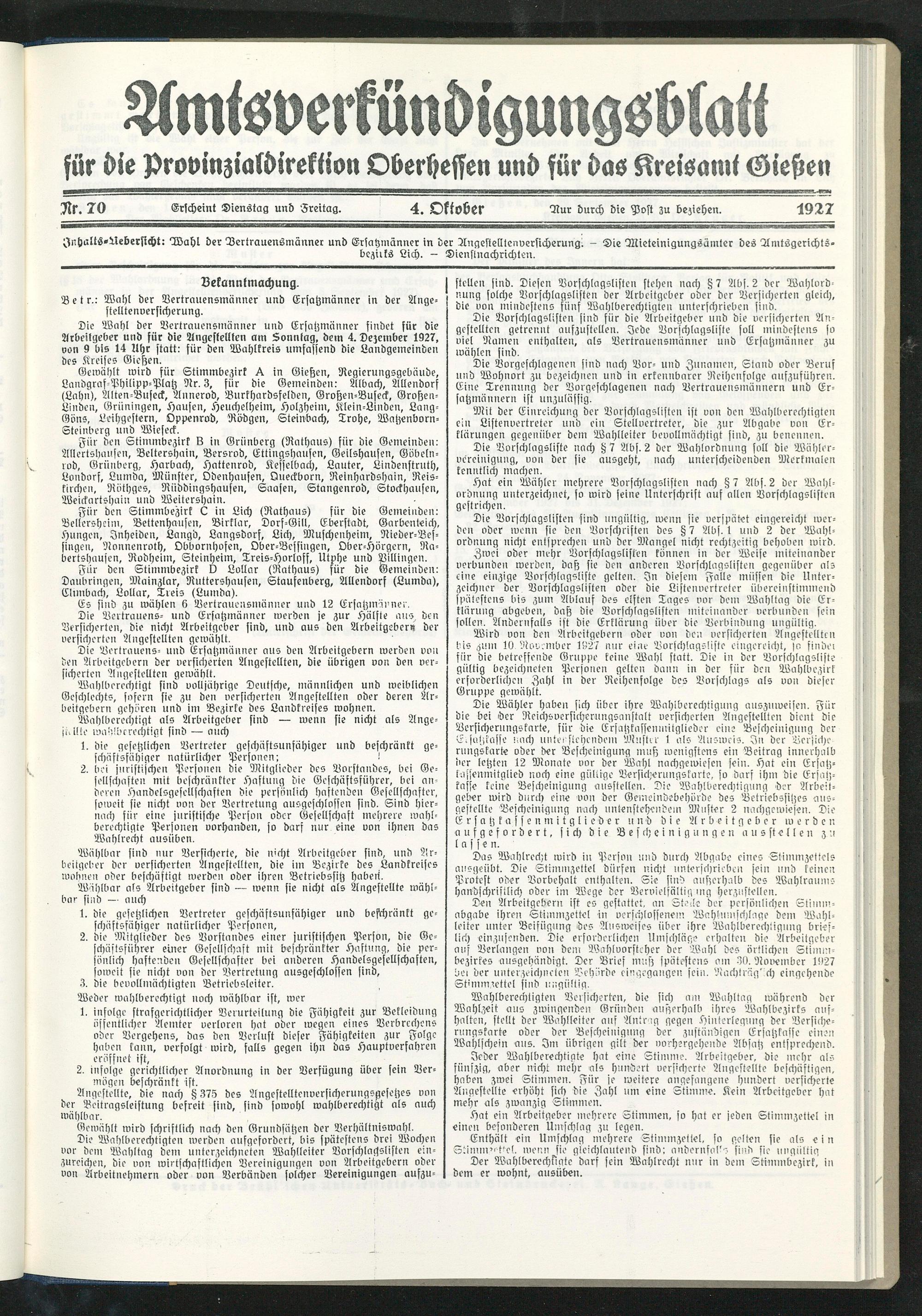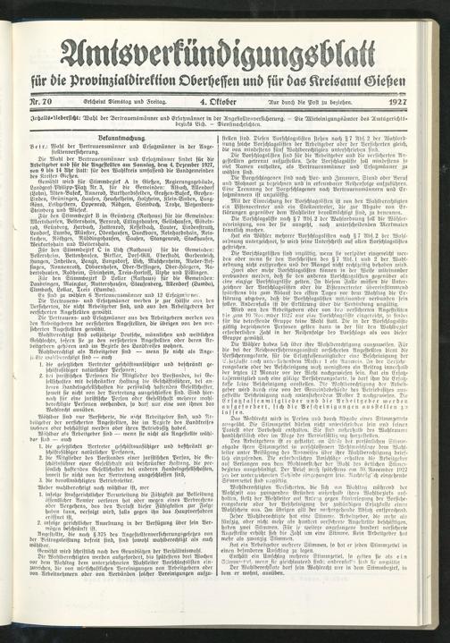 Amtsverkündigungsblatt für die Provinzialdirektion Oberhessen und der Kreisämter Gießen, Friedberg, Büdingen, Lauterbach, Schotten und Alsfeld. 1919-1937