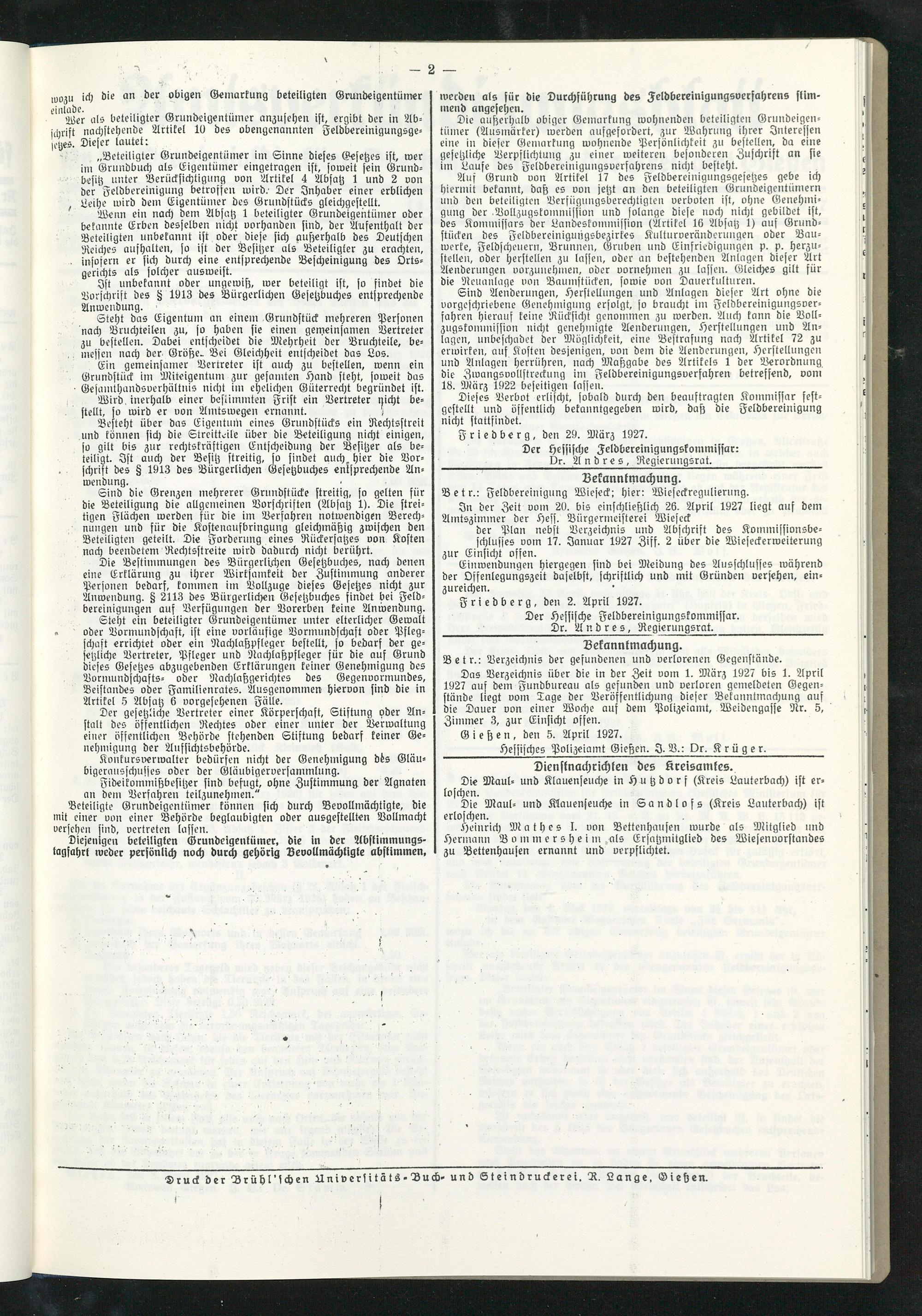 Amtsverkündigungsblatt für die Provinzialdirektion Oberhessen und der Kreisämter Gießen, Friedberg, Büdingen, Lauterbach, Schotten und Alsfeld. 1919-1937