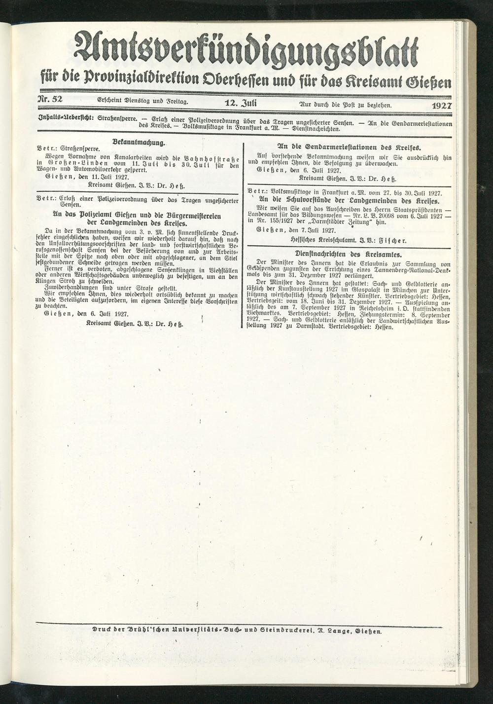 Amtsverkündigungsblatt für die Provinzialdirektion Oberhessen und der Kreisämter Gießen, Friedberg, Büdingen, Lauterbach, Schotten und Alsfeld. 1919-1937
