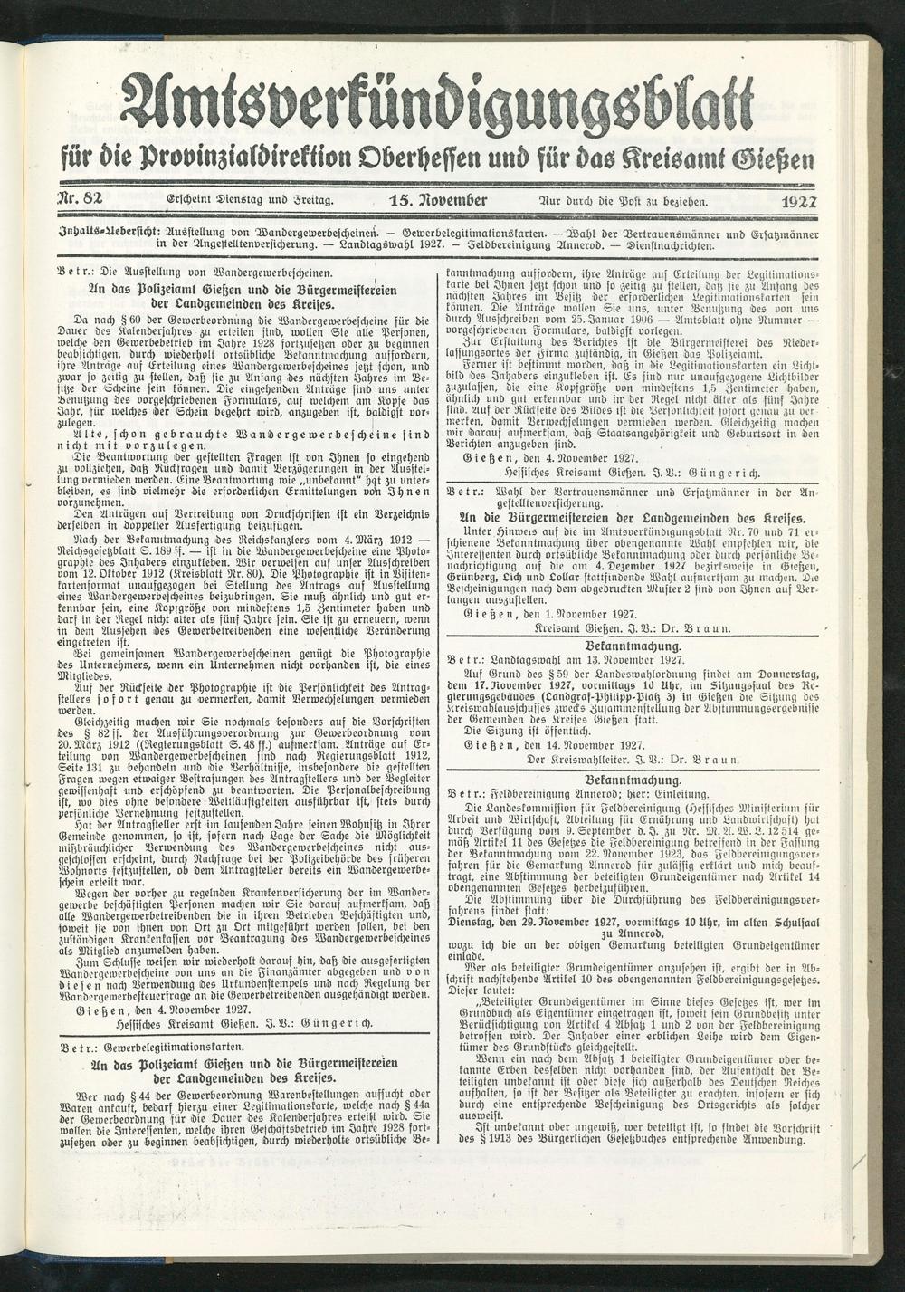 Amtsverkündigungsblatt für die Provinzialdirektion Oberhessen und der Kreisämter Gießen, Friedberg, Büdingen, Lauterbach, Schotten und Alsfeld. 1919-1937