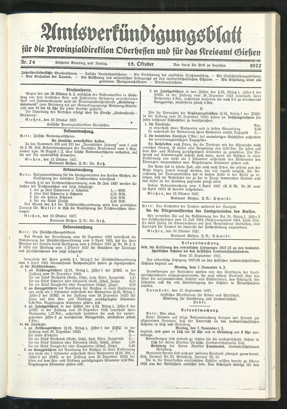 Amtsverkündigungsblatt für die Provinzialdirektion Oberhessen und der Kreisämter Gießen, Friedberg, Büdingen, Lauterbach, Schotten und Alsfeld. 1919-1937