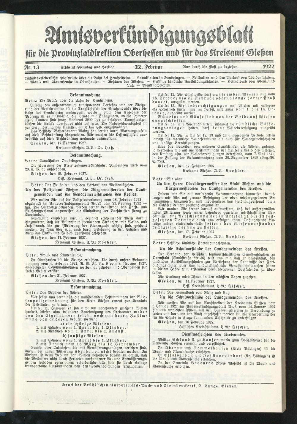 Amtsverkündigungsblatt für die Provinzialdirektion Oberhessen und der Kreisämter Gießen, Friedberg, Büdingen, Lauterbach, Schotten und Alsfeld. 1919-1937
