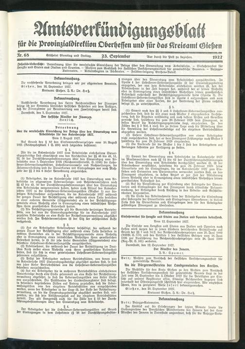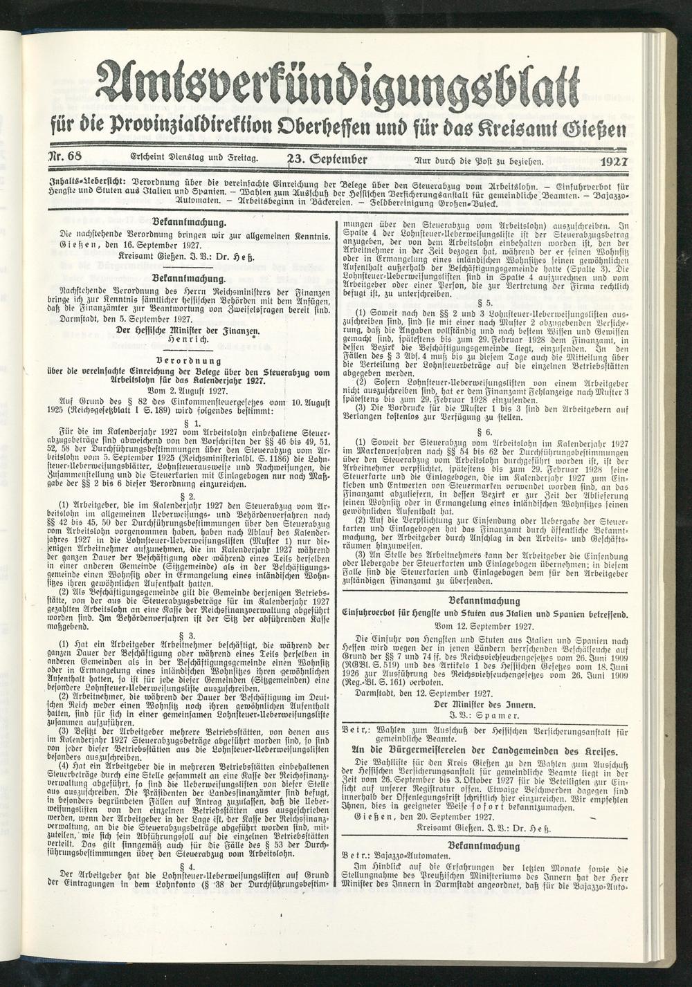 Amtsverkündigungsblatt für die Provinzialdirektion Oberhessen und der Kreisämter Gießen, Friedberg, Büdingen, Lauterbach, Schotten und Alsfeld. 1919-1937