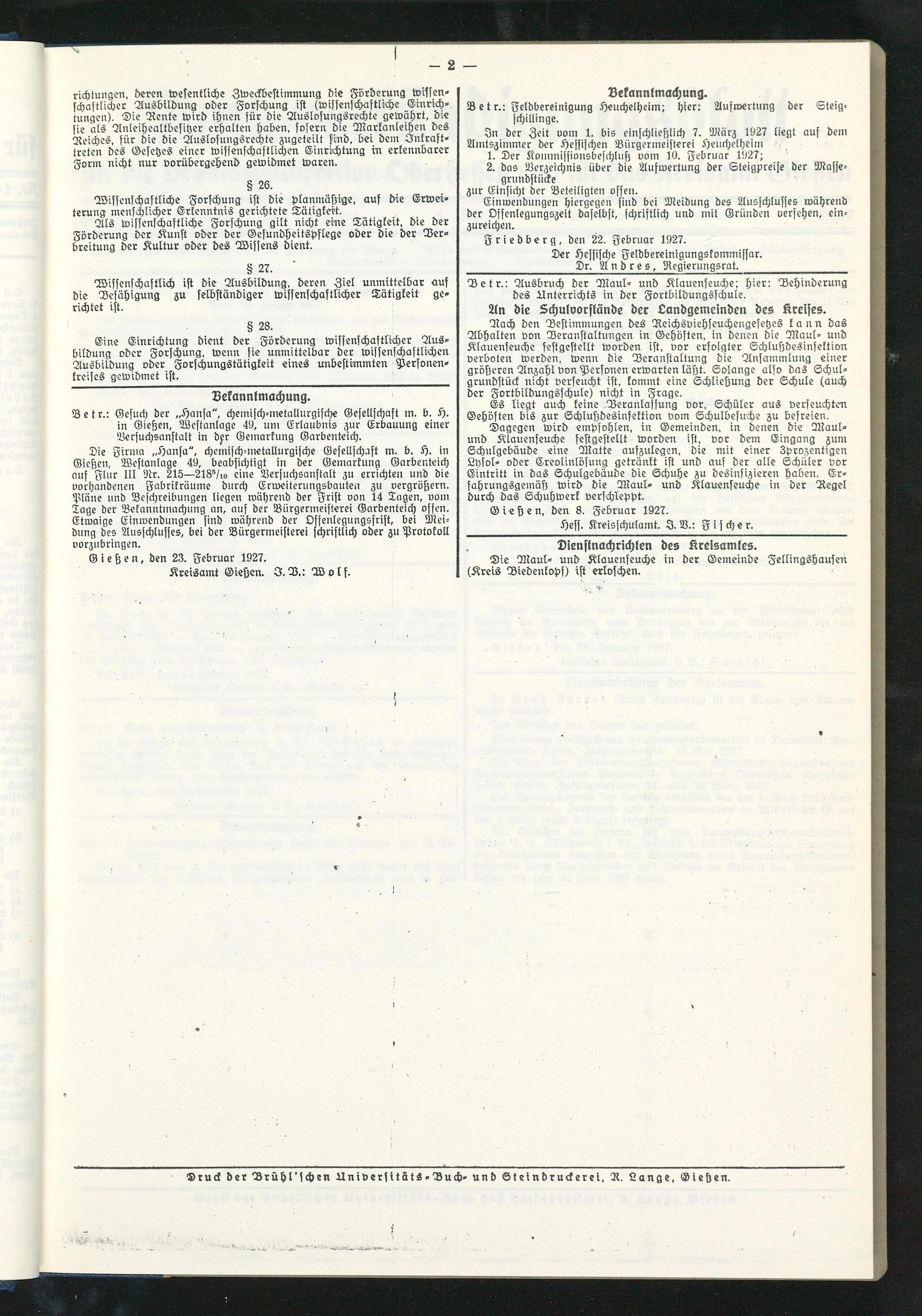 Amtsverkündigungsblatt für die Provinzialdirektion Oberhessen und der Kreisämter Gießen, Friedberg, Büdingen, Lauterbach, Schotten und Alsfeld. 1919-1937