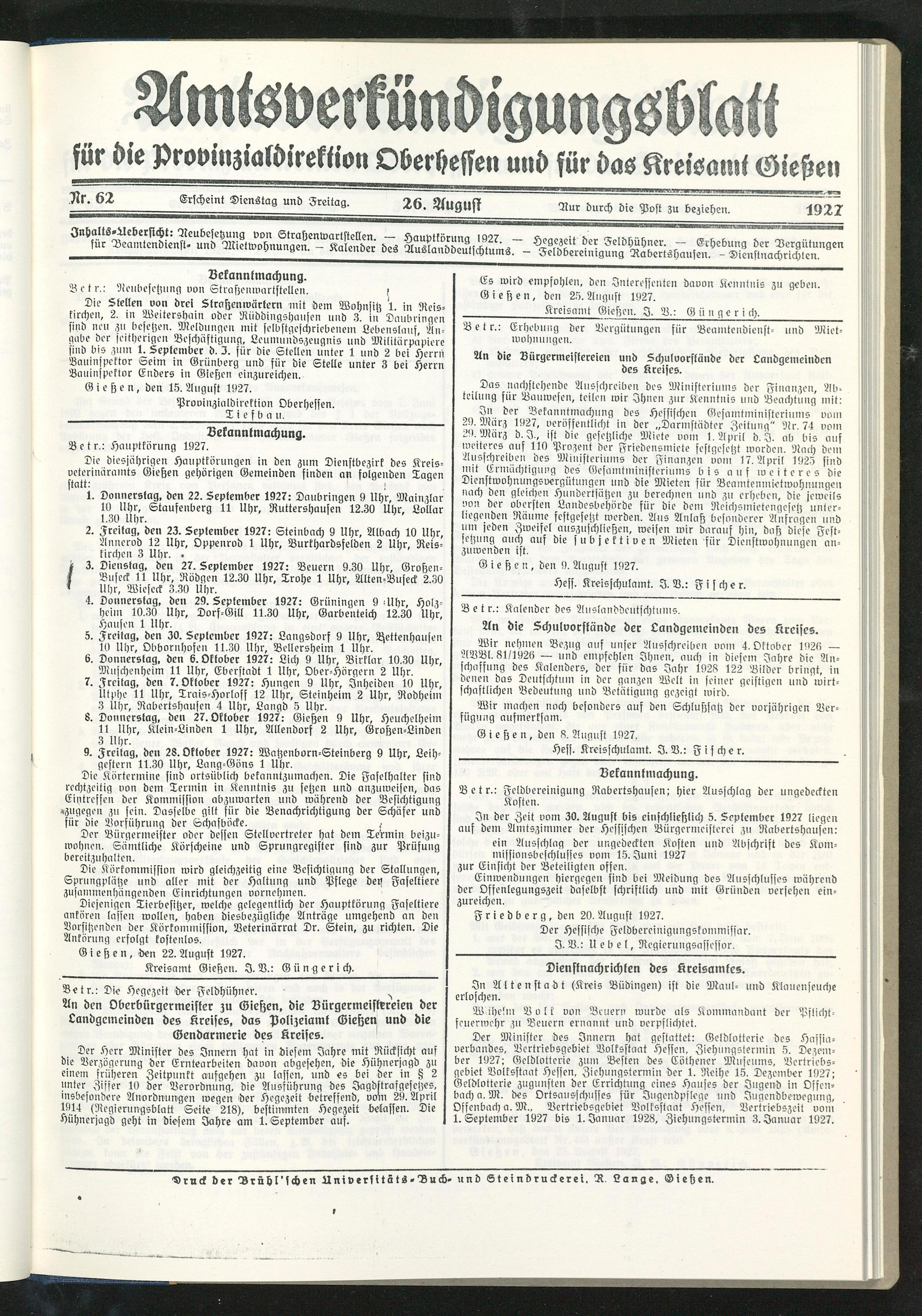 Amtsverkündigungsblatt für die Provinzialdirektion Oberhessen und der Kreisämter Gießen, Friedberg, Büdingen, Lauterbach, Schotten und Alsfeld. 1919-1937