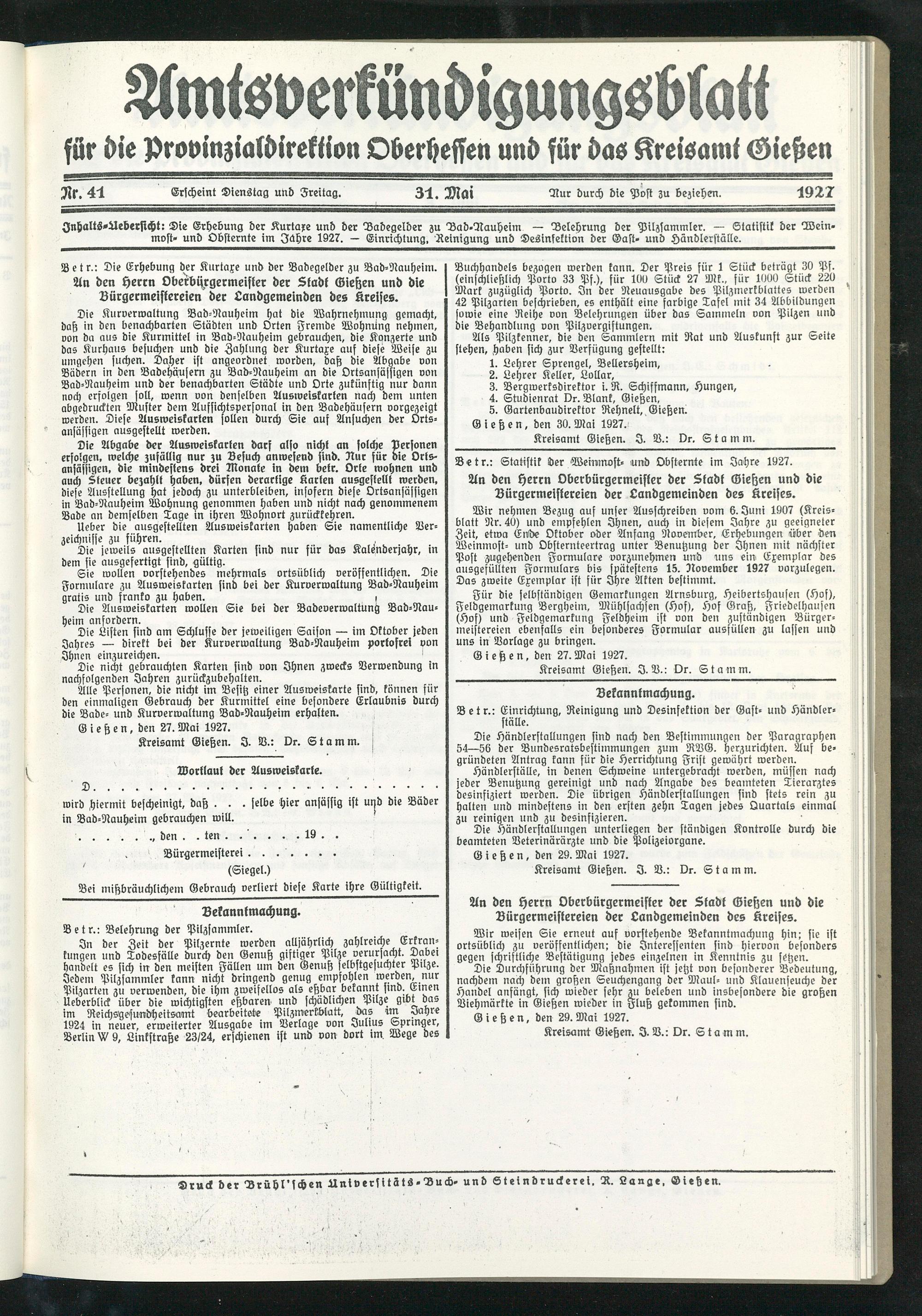 Amtsverkündigungsblatt für die Provinzialdirektion Oberhessen und der Kreisämter Gießen, Friedberg, Büdingen, Lauterbach, Schotten und Alsfeld. 1919-1937