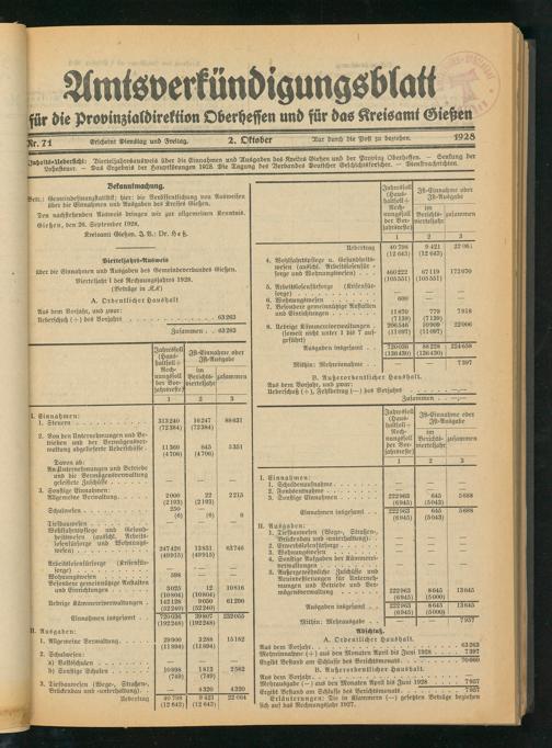 Amtsverkündigungsblatt für die Provinzialdirektion Oberhessen und der Kreisämter Gießen, Friedberg, Büdingen, Lauterbach, Schotten und Alsfeld. 1919-1937