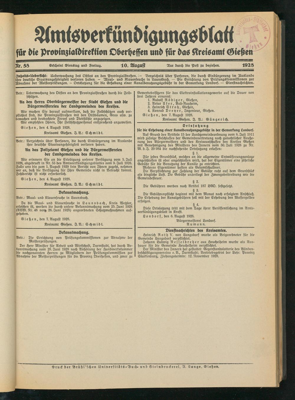 Amtsverkündigungsblatt für die Provinzialdirektion Oberhessen und der Kreisämter Gießen, Friedberg, Büdingen, Lauterbach, Schotten und Alsfeld. 1919-1937