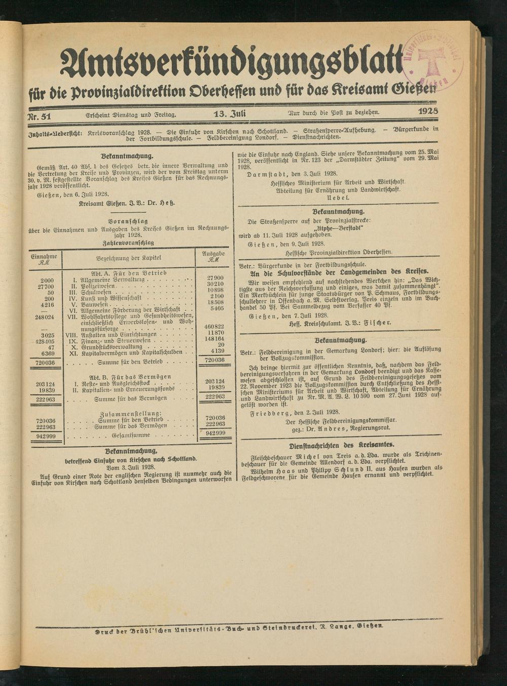 Amtsverkündigungsblatt für die Provinzialdirektion Oberhessen und der Kreisämter Gießen, Friedberg, Büdingen, Lauterbach, Schotten und Alsfeld. 1919-1937