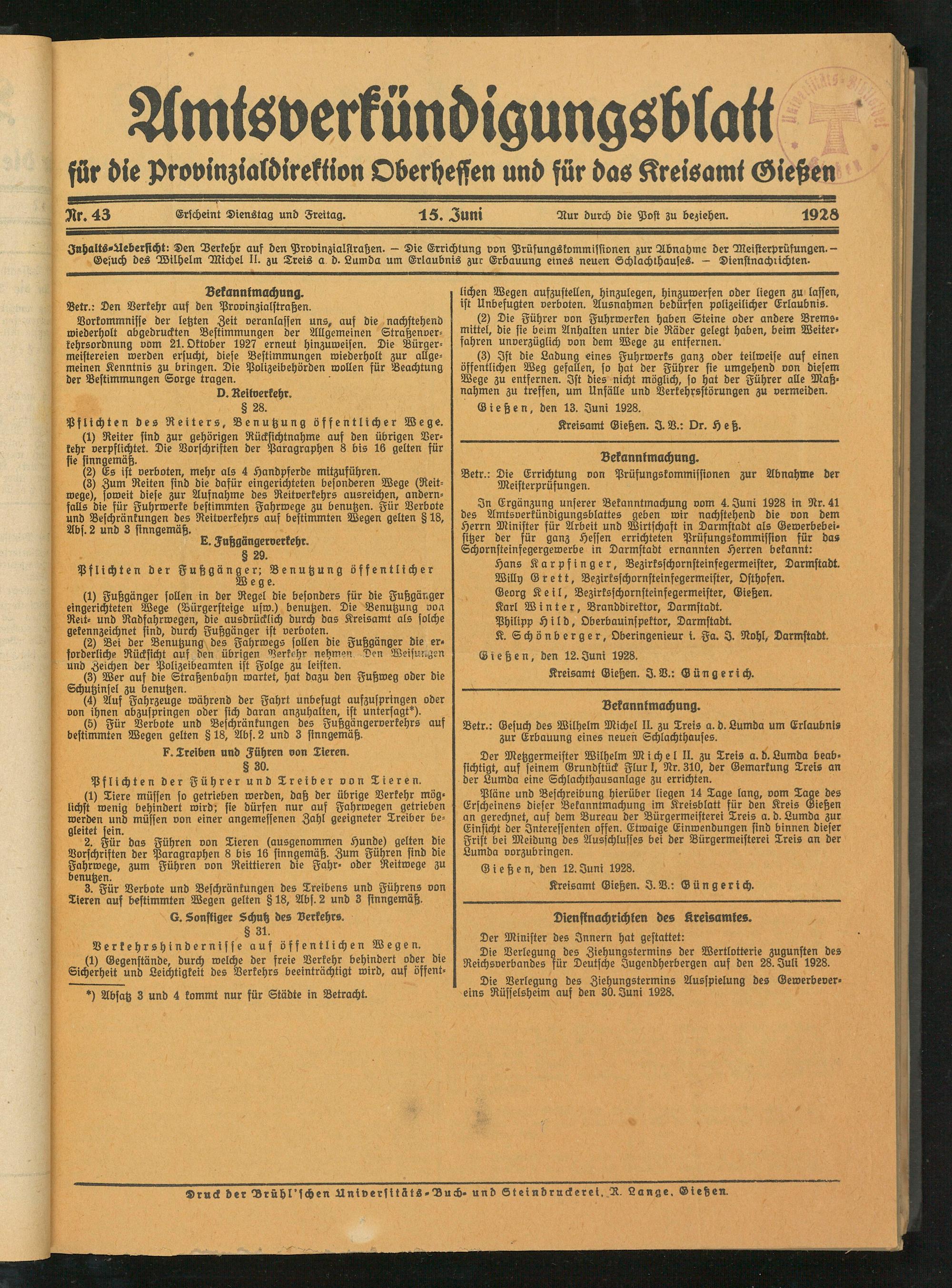 Amtsverkündigungsblatt für die Provinzialdirektion Oberhessen und der Kreisämter Gießen, Friedberg, Büdingen, Lauterbach, Schotten und Alsfeld. 1919-1937