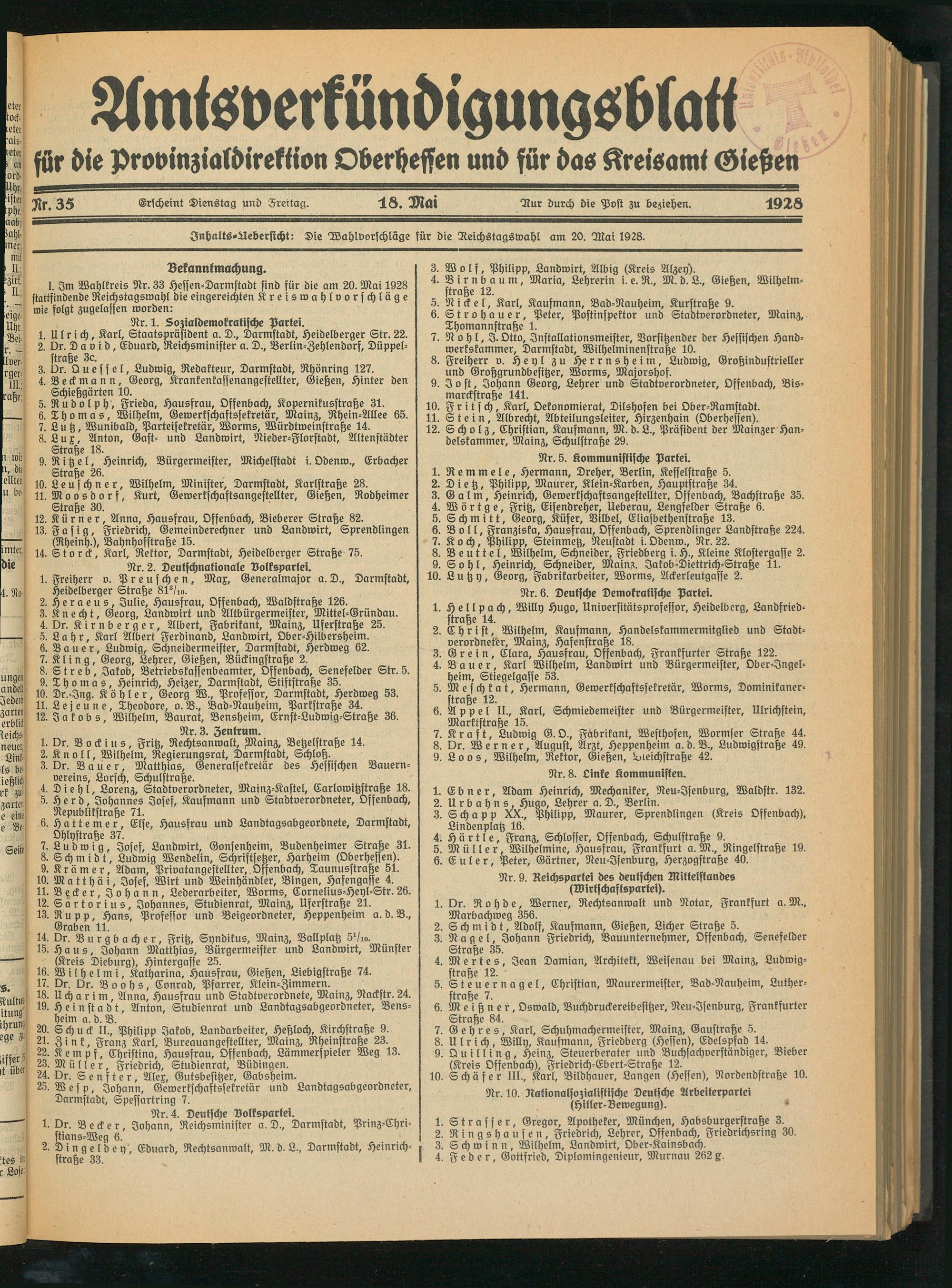 Amtsverkündigungsblatt für die Provinzialdirektion Oberhessen und der Kreisämter Gießen, Friedberg, Büdingen, Lauterbach, Schotten und Alsfeld. 1919-1937
