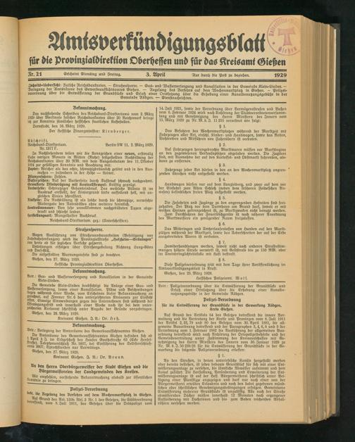 Amtsverkündigungsblatt für die Provinzialdirektion Oberhessen und der Kreisämter Gießen, Friedberg, Büdingen, Lauterbach, Schotten und Alsfeld. 1919-1937