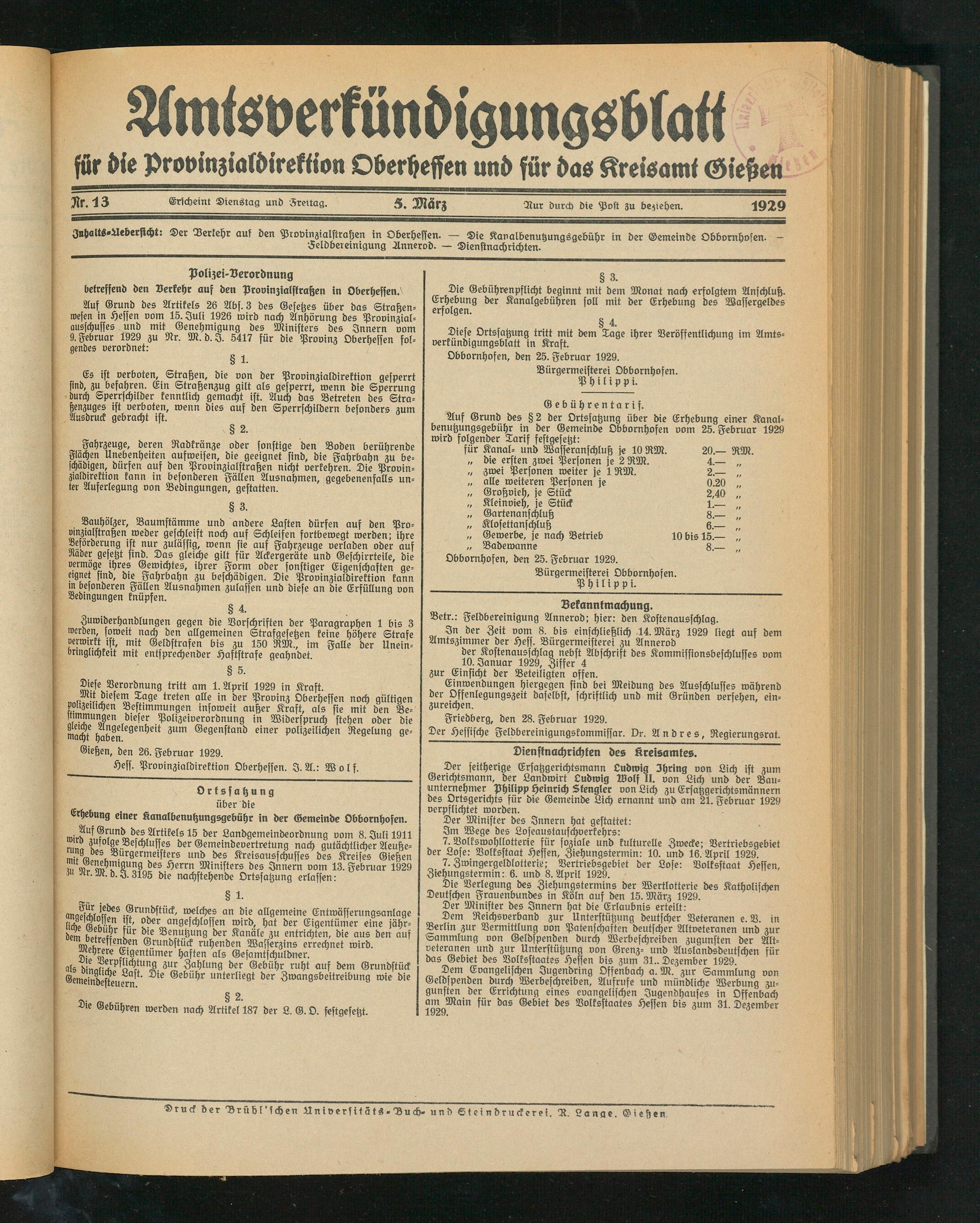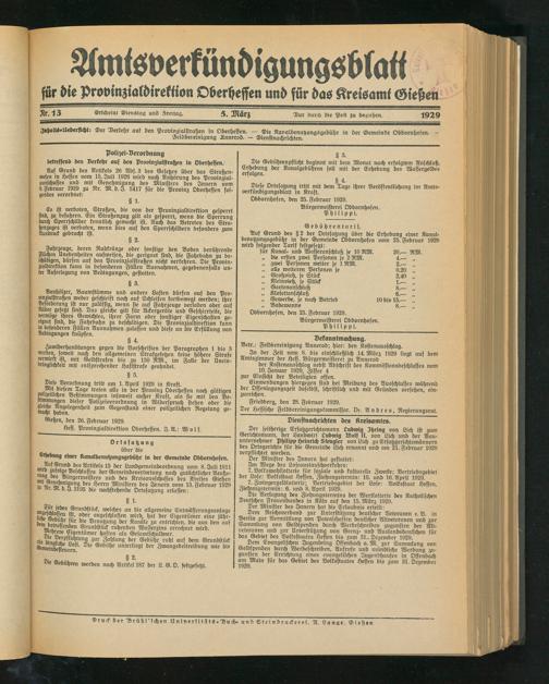 Amtsverkündigungsblatt für die Provinzialdirektion Oberhessen und der Kreisämter Gießen, Friedberg, Büdingen, Lauterbach, Schotten und Alsfeld. 1919-1937