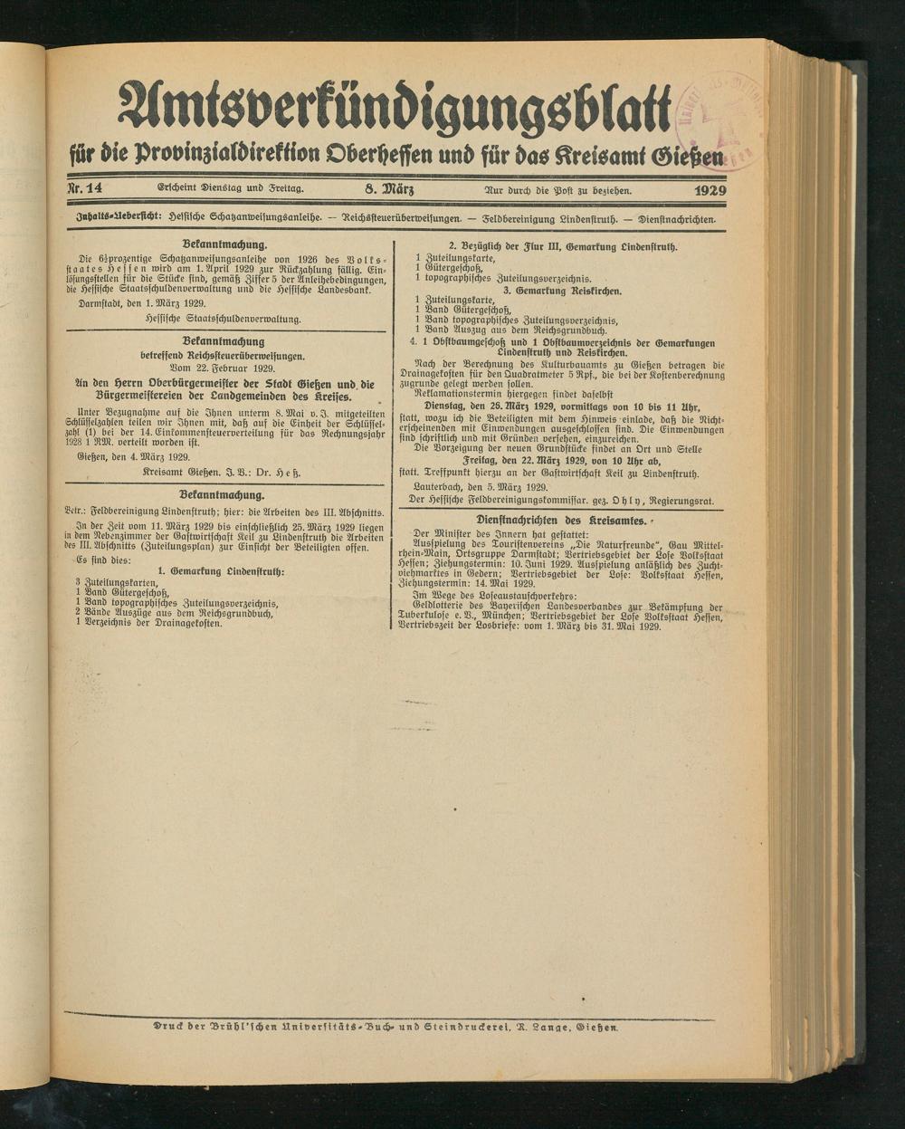 Amtsverkündigungsblatt für die Provinzialdirektion Oberhessen und der Kreisämter Gießen, Friedberg, Büdingen, Lauterbach, Schotten und Alsfeld. 1919-1937