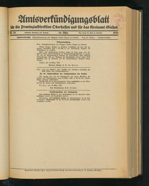 Amtsverkündigungsblatt für die Provinzialdirektion Oberhessen und der Kreisämter Gießen, Friedberg, Büdingen, Lauterbach, Schotten und Alsfeld. 1919-1937