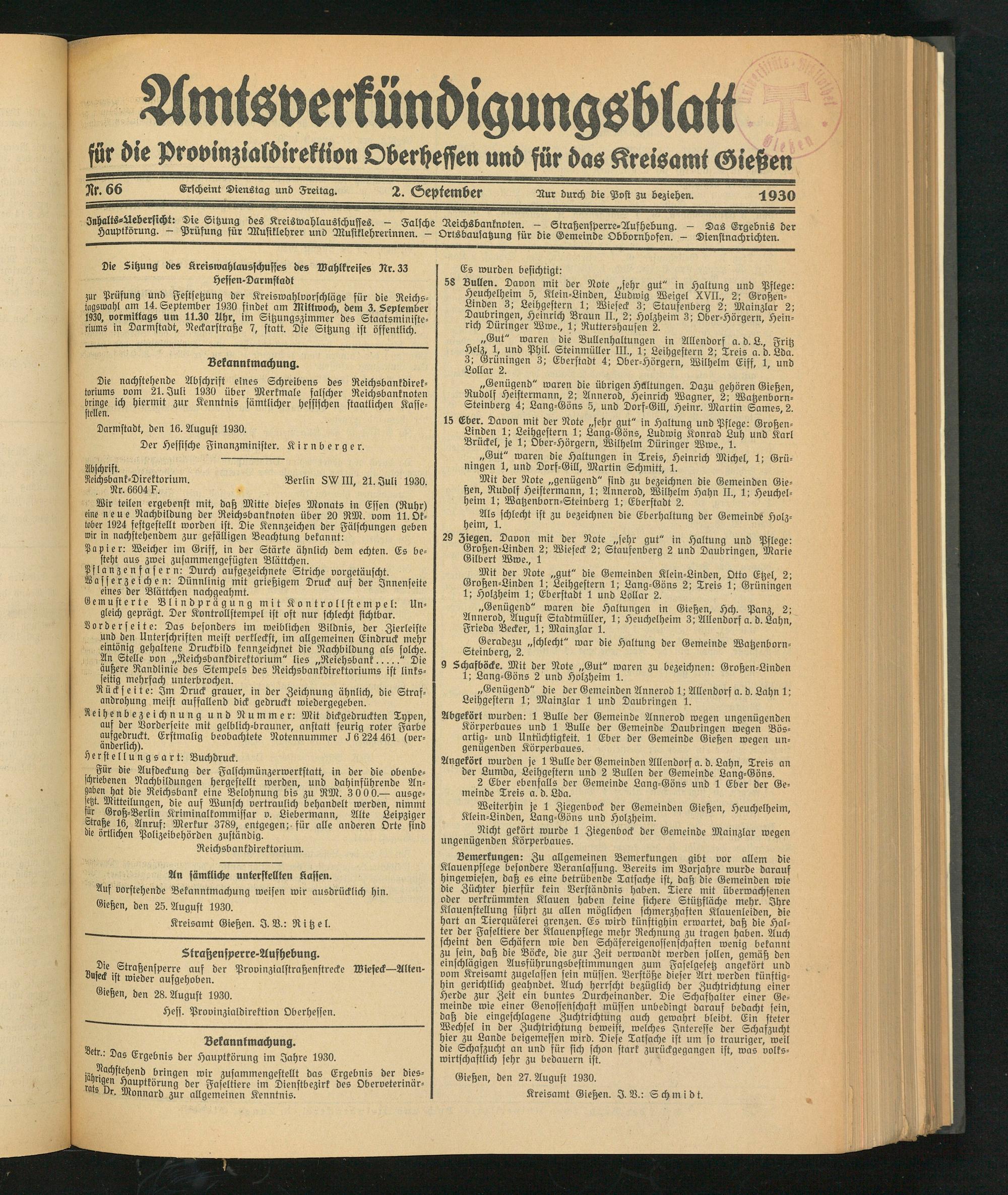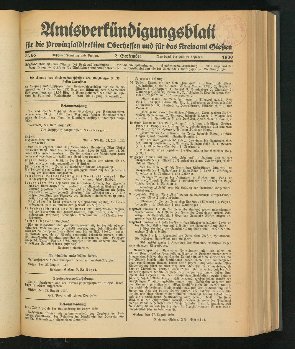 Amtsverkündigungsblatt für die Provinzialdirektion Oberhessen und der Kreisämter Gießen, Friedberg, Büdingen, Lauterbach, Schotten und Alsfeld. 1919-1937