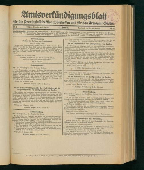 Amtsverkündigungsblatt für die Provinzialdirektion Oberhessen und der Kreisämter Gießen, Friedberg, Büdingen, Lauterbach, Schotten und Alsfeld. 1919-1937