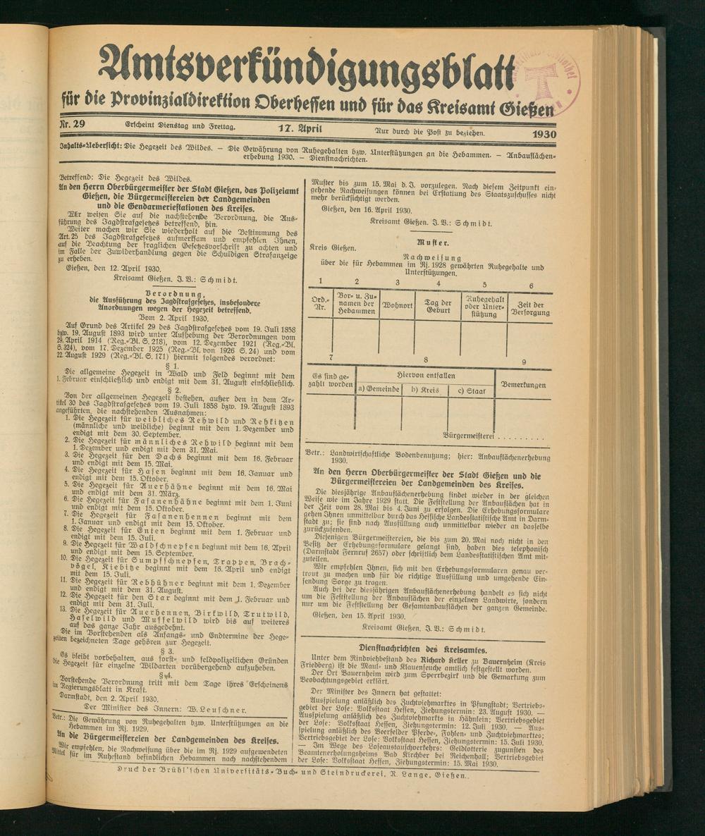 Amtsverkündigungsblatt für die Provinzialdirektion Oberhessen und der Kreisämter Gießen, Friedberg, Büdingen, Lauterbach, Schotten und Alsfeld. 1919-1937