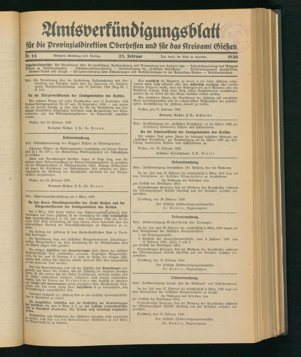 Amtsverkündigungsblatt für die Provinzialdirektion Oberhessen und der Kreisämter Gießen, Friedberg, Büdingen, Lauterbach, Schotten und Alsfeld. 1919-1937